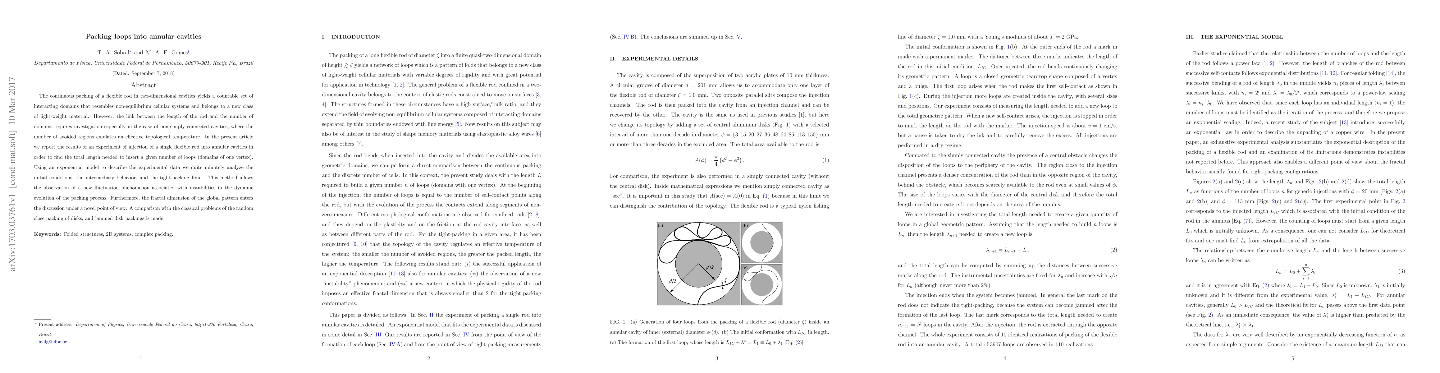 The continuous packing of a flexible rod in two-dimensional cavities yields a countable set of interacting domains that resembles non-equilibrium cellular systems and belongs to a new class of light-weight material. However, the link between the length of the rod and the number of domains requires investigation especially in the case of non-simply connected cavities, where the number of avoided regions emulates an effective topological temperature. In the present article we report the results of an experiment of injection of a single flexible rod into annular cavities in order to find the total length needed to insert a given number of loops (domains of one vertex). Using an exponential model to describe the experimental data we quite minutely analyze the initial conditions, the intermediary behavior, and the tight-packing limit. This method allows the observation of a new fluctuation phenomenon associated with instabilities in the dynamic evolution of the packing process. Furthermore, the fractal dimension of the global pattern enters the discussion under a novel point of view. A comparison with the classical problems of the random close packing of disks, and jammed disk packings is made.