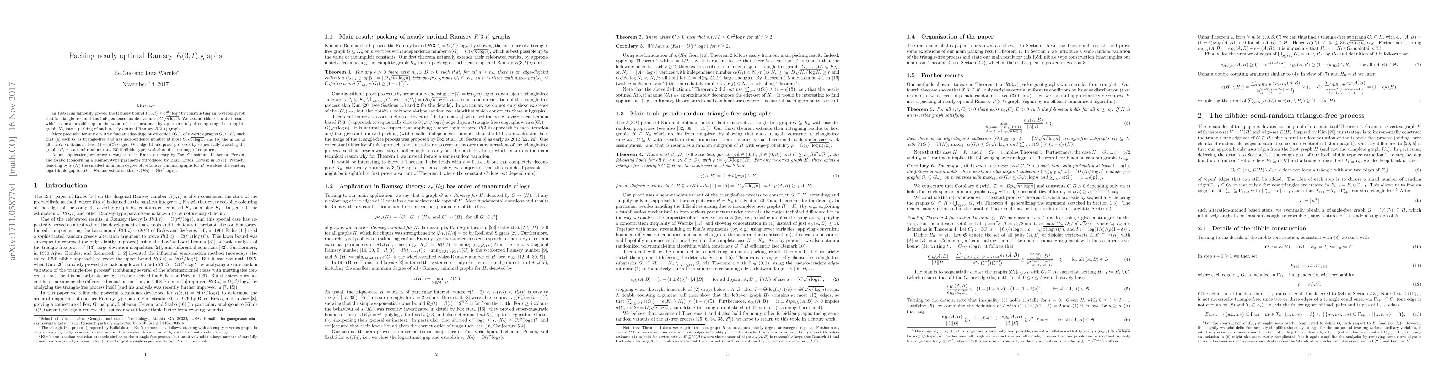 The paper extends Kim's 1995 result on Ramsey bounds by approximately decomposing the complete graph K_n into a packing of nearly optimal Ramsey R(3,t) graphs. The proof uses a semi-random variation of the triangle-free process and provides bounds for degree-like, codegree-like variables, and the number of open edges.