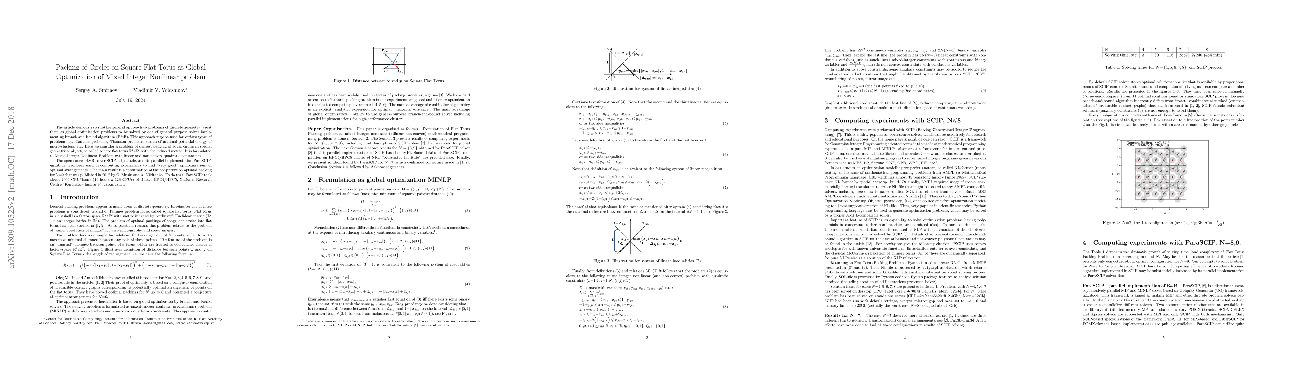 The article demonstrates rather general approach to problems of discrete geometry: treat them as global optimization problems to be solved by one of general purpose solver implementing branch-and-bound algorithm (B&B). This approach may be used for various types of problems, i.e. Tammes problems, Thomson problems, search of minimal potential energy of micro-clusters, etc. Here we consider a problem of densest packing of equal circles in special geometrical object, so called square flat torus $\mathbb{R}^2/\mathbb{Z}^2$ with the induced metric. It is formulated as Mixed-Integer Nonlinear Problem with linear and non-convex quadratic constraints. The open-source B&B-solver SCIP, http://scip.zib.de, and its parallel implementation ParaSCIP, http://ug.zib.de, had been used in computing experiments to find "very good" approximations of optimal arrangements. The main result is a confirmation of the conjecture on optimal packing for N=9 that was published in 2012 by O. Musin and A. Nikitenko. To do that, ParaSCIP took about 2000 CPU*hours (16 hours x 128 CPUs) of cluster HPC4/HPC5, National Research Centre "Kurchatov Institute", http://ckp.nrcki.ru