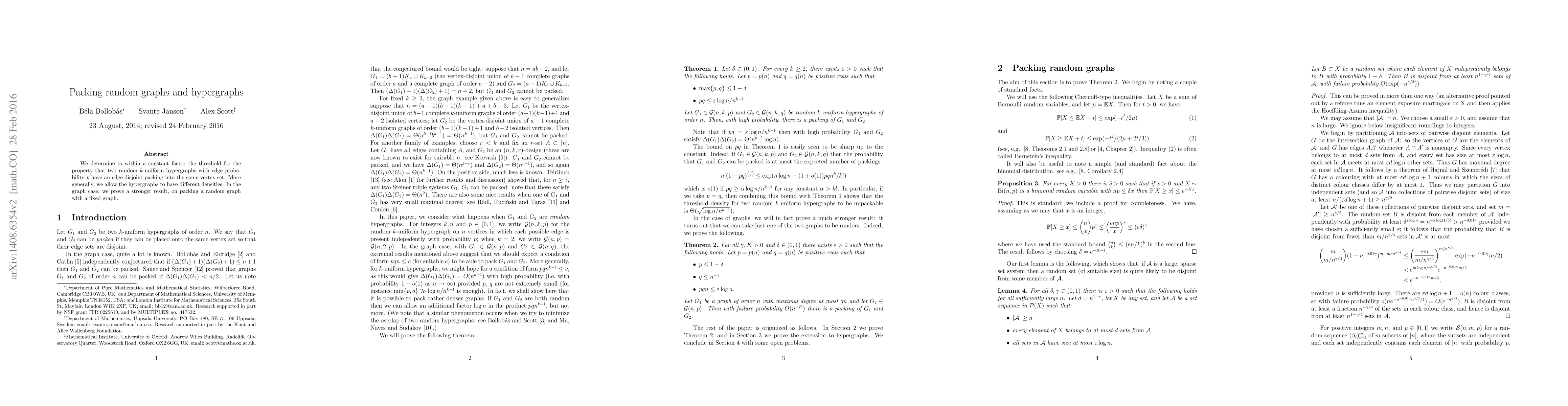 Summary: This paper determines the threshold for packing edge-disjoint copies of random k-uniform hypergraphs into the same vertex set, with a focus on varying edge probabilities and densities. For random graphs, it proves a stronger result on packing a random graph with a fixed graph.