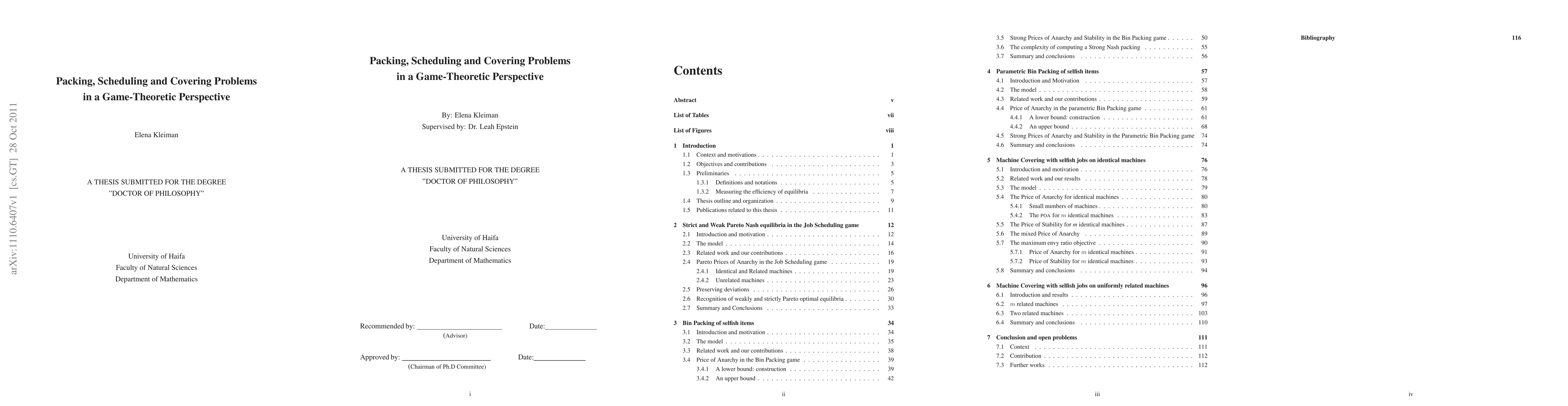 This paper explores packing, scheduling, and covering problems from a game-theoretic perspective, applying them to network optimization issues like routing and congestion control. It introduces new models for the bin packing, job scheduling, and machine covering problems, combining game theory with combinatorial optimization to improve existing results and propose novel interpretations.