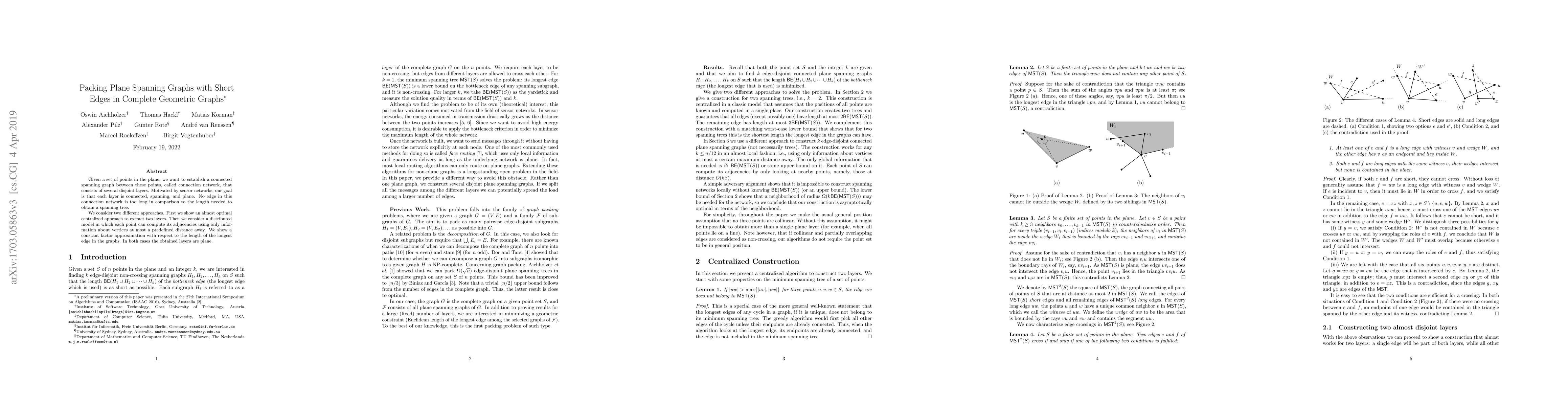 This paper explores methods to create multiple plane spanning graph layers between a set of points in a plane, ensuring each layer is disjoint and edges are not excessively long. It presents an almost optimal centralized approach and a constant factor approximation for a distributed model, both yielding plane spanning graphs.