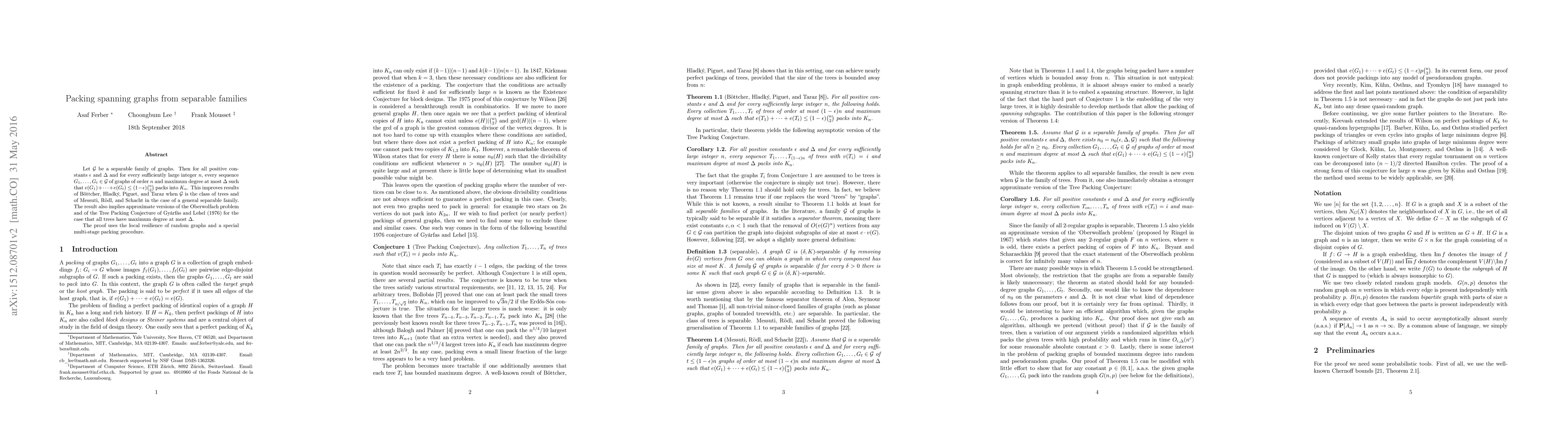 Researchers prove that a large enough sequence of graphs from a separable family can be packed into a complete graph of the same order, improving previous results for tree families and general separable families.
