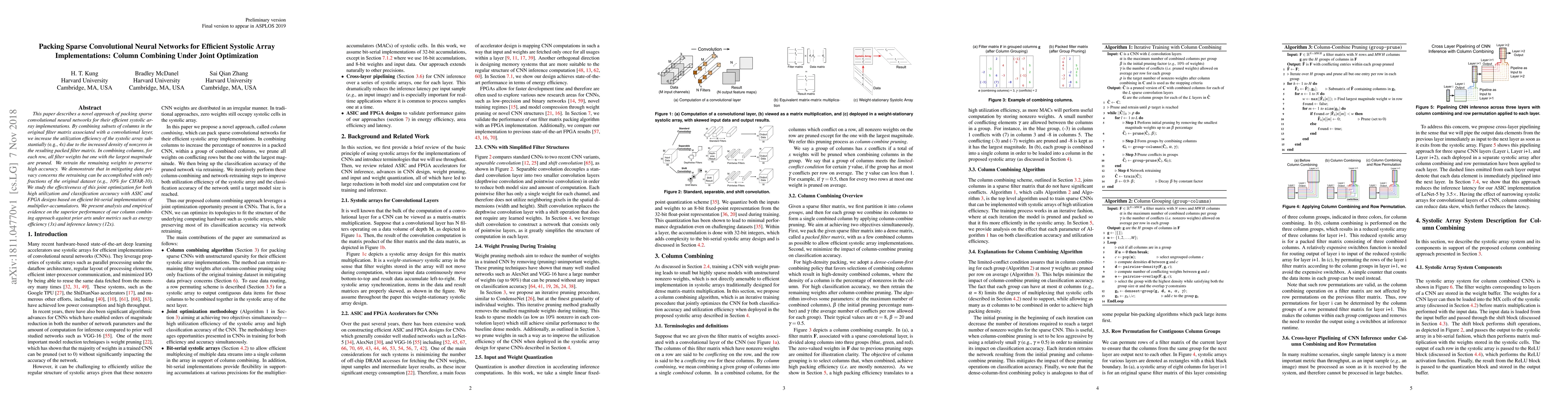 This paper proposes a method to pack sparse convolutional neural networks for efficient systolic array implementations by combining columns in filter matrices, significantly improving utilization efficiency and performance metrics like energy efficiency and latency. The approach involves pruning and retraining to maintain accuracy while addressing data privacy concerns.
