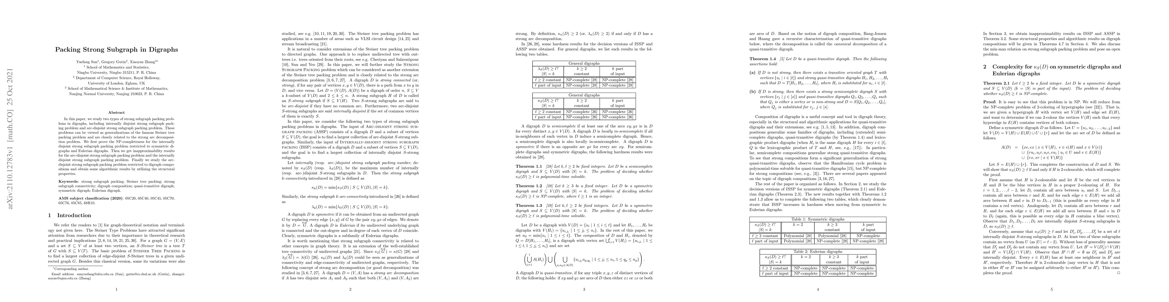 This paper investigates two strong subgraph packing problems in digraphs, proving NP-completeness and inapproximability results for specific cases. It also explores algorithmic solutions for arc-disjoint packing in digraph compositions.