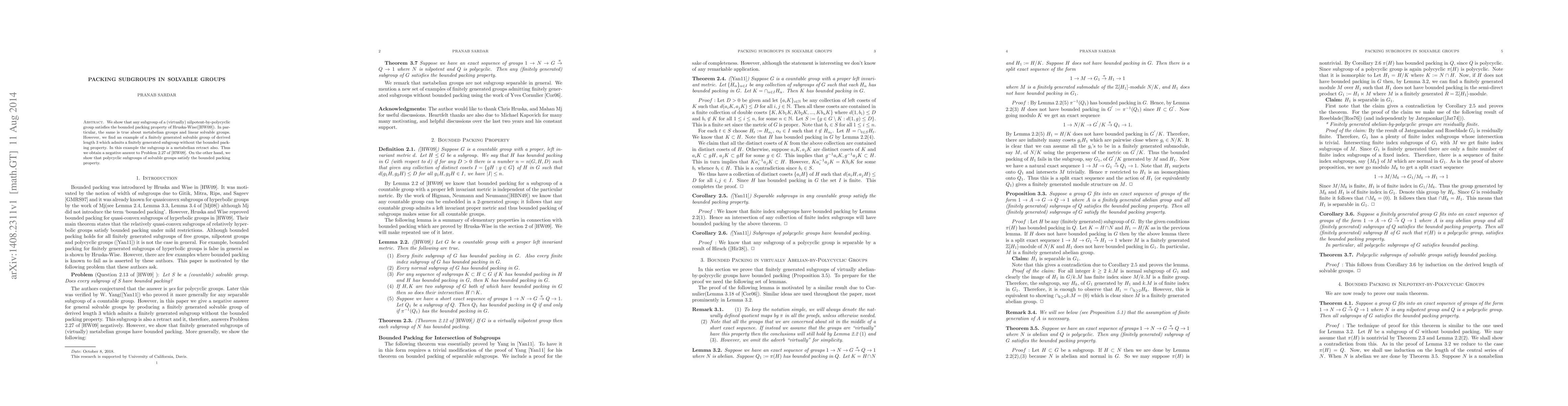 We show that any subgroup of a (virtually) nilpotent-by-polycyclic group satisfies the bounded packing property of Hruska-Wise. In particular, the same is true about metabelian groups and linear solvable groups. However, we find an example of a finitely generated solvable group of derived length 3 which admits a finitely generated subgroup without the bounded packing property. In this example the subgroup is a metabelian retract also. Thus we obtain a negative answer to Problem 2.27 of Hruska-Wise. On the other hand, we show that polycyclic subgroups of solvable groups satisfy the bounded packing property.