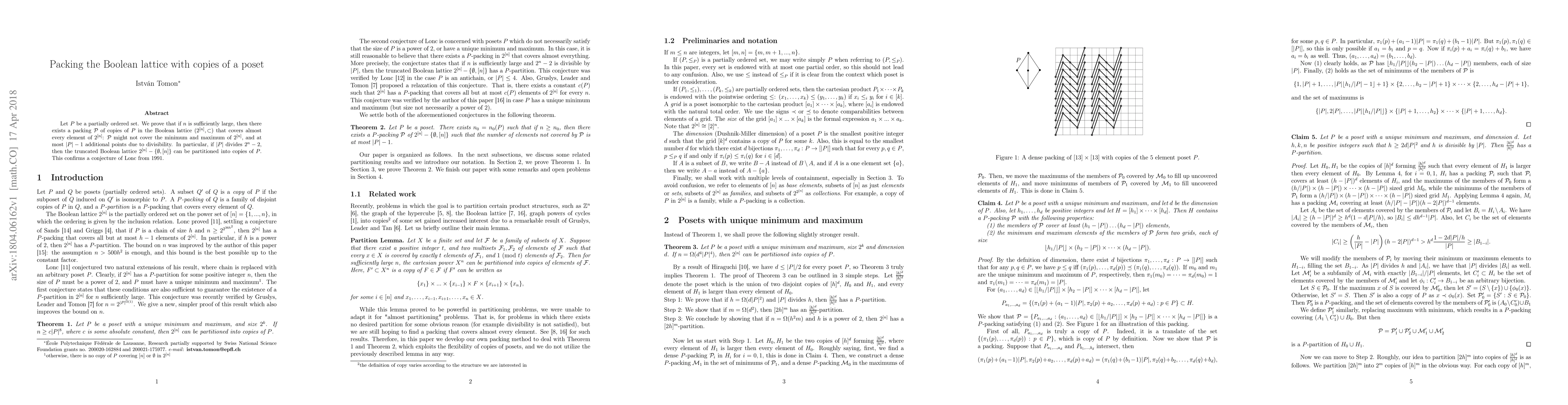 This paper proves that for sufficiently large $n$, the Boolean lattice can be packed with copies of a given poset $P$ to cover almost every element, with at most $|P|-1$ additional points. If $|P|$ divides $2^n-2$, the truncated Boolean lattice can be partitioned into copies of $P$, confirming a 1991 conjecture by Lonc.
