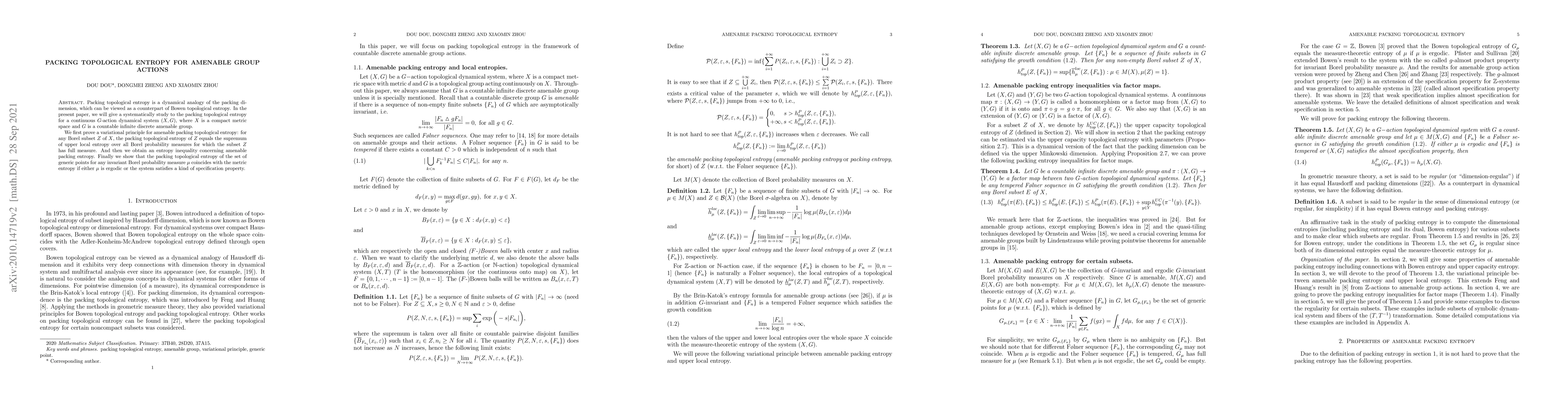 This paper investigates packing topological entropy in continuous $G$-action dynamical systems, where $G$ is a countable discrete amenable group. It establishes a variational principle and an entropy inequality for amenable packing entropy, and shows that the packing topological entropy of generic points equals the metric entropy under certain conditions.