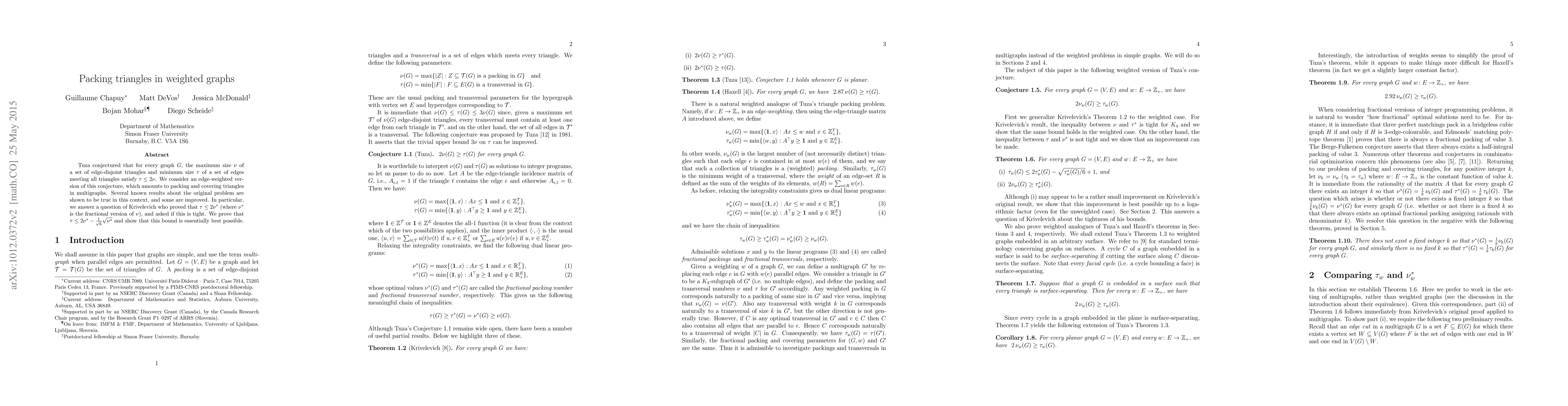 Researchers investigate a weighted version of Tuza's conjecture on packing triangles in multigraphs, improving existing bounds on the relationship between edge-disjoint triangle coverings and triangle packings.
