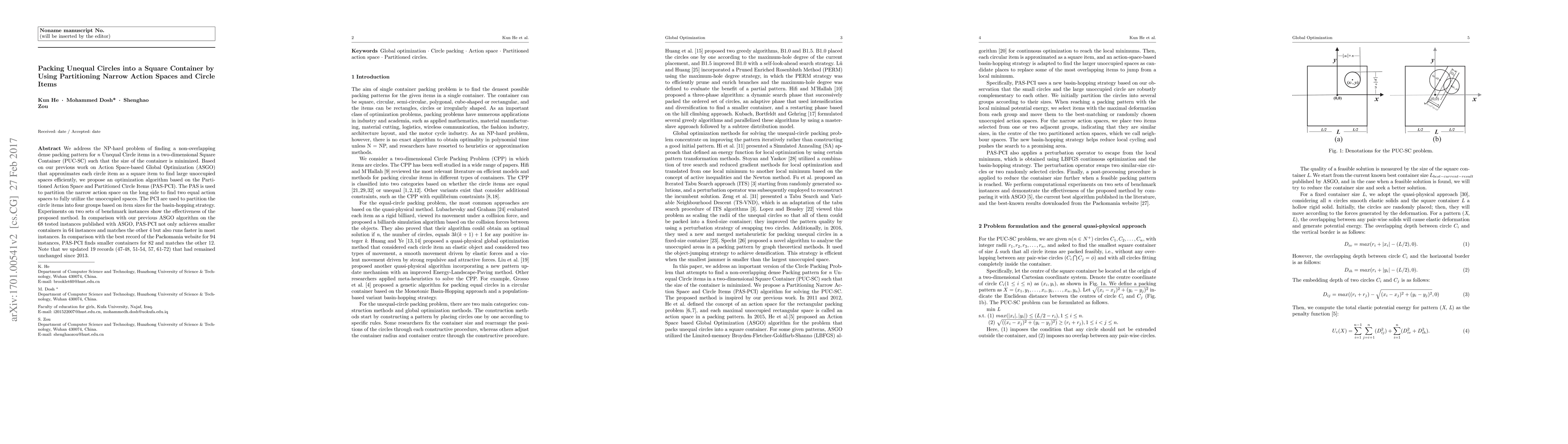 This paper proposes a new optimization algorithm, PAS-PCI, to efficiently pack n unequal circles into a square container while minimizing the container size. The method partitions narrow action spaces and groups circles by size for better utilization, outperforming previous algorithms in most tested instances and setting new records for container size.