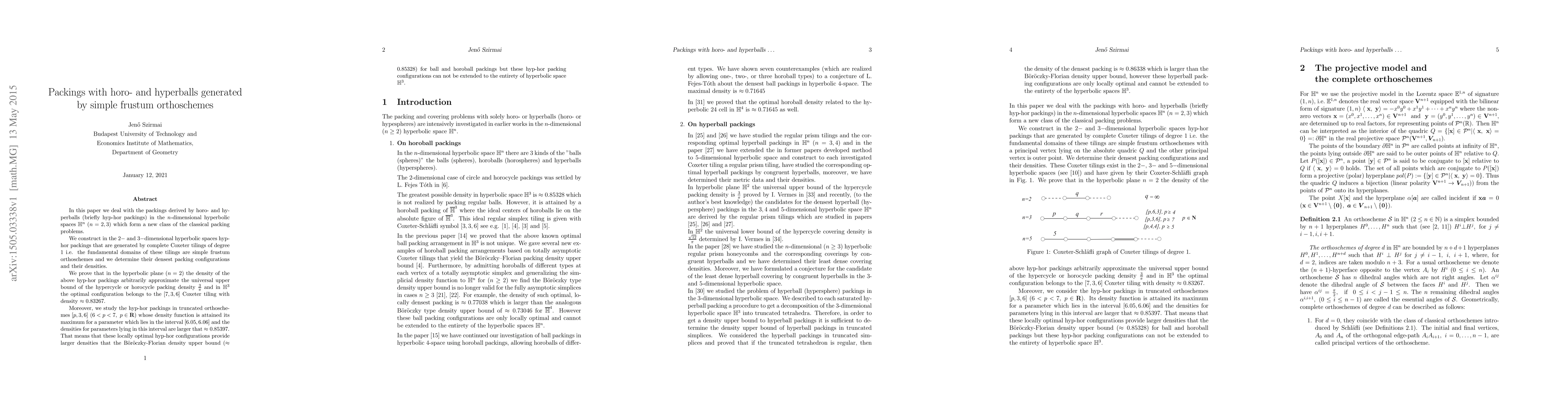 In this paper we deal with the packings derived by horo- and hyperballs (briefly hyp-hor packings) in the $n$-dimensional hyperbolic spaces $\HYN$ ($n=2,3$) which form a new class of the classical packing problems. We construct in the $2-$ and $3-$dimensional hyperbolic spaces hyp-hor packings that are generated by complete Coxeter tilings of degree $1$ i.e. the fundamental domains of these tilings are simple frustum orthoschemes and we determine their densest packing configurations and their densities. We prove that in the hyperbolic plane ($n=2$) the density of the above hyp-hor packings arbitrarily approximate the universal upper bound of the hypercycle or horocycle packing density $\frac{3}{\pi}$ and in $\HYP$ the optimal configuration belongs to the $[7,3,6]$ Coxeter tiling with density $\approx 0.83267$. Moreover, we study the hyp-hor packings in truncated orthosche\-mes $[p,3,6]$ $(6< p < 7, ~ p\in \bR)$ whose density function is attained its maximum for a parameter which lies in the interval $[6.05,6.06]$ and the densities for parameters lying in this interval are larger that $\approx 0.85397$. That means that these locally optimal hyp-hor configurations provide larger densities that the B\"or\"oczky-Florian density upper bound $(\approx 0.85328)$ for ball and horoball packings but these hyp-hor packing configurations can not be extended to the entirety of hyperbolic space $\mathbb{H}^3$.