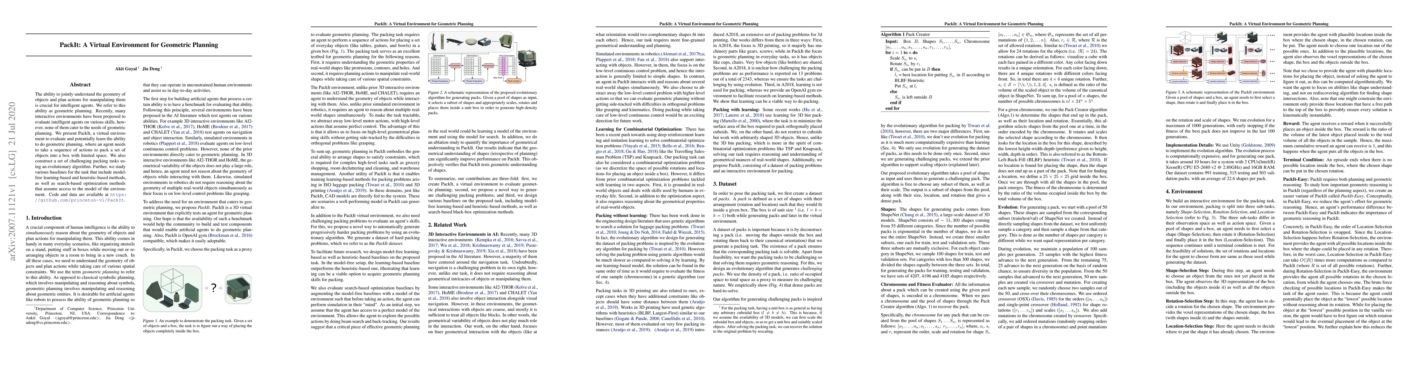PackIt is a virtual environment designed to evaluate and facilitate the learning of geometric planning, where agents must pack objects into a constrained box. The study introduces challenging packing tasks and evaluates various baselines, including model-free learning, heuristics, and search-based optimization methods.