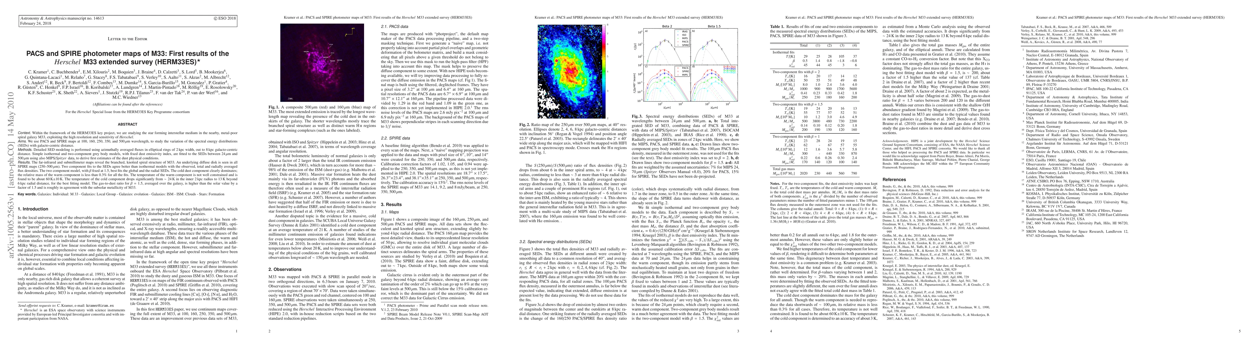 The Herschel M33 extended survey (HERM33ES) used PACS and SPIRE maps to study M33's star-forming interstellar medium, revealing its spiral structure and a diffuse disk. SED modeling indicated two dust components, with cold dust dominating and temperature decreasing with galacto-centric distance. The gas-to-dust ratio was found to be higher than the solar value, aligning with M33's subsolar metallicity.