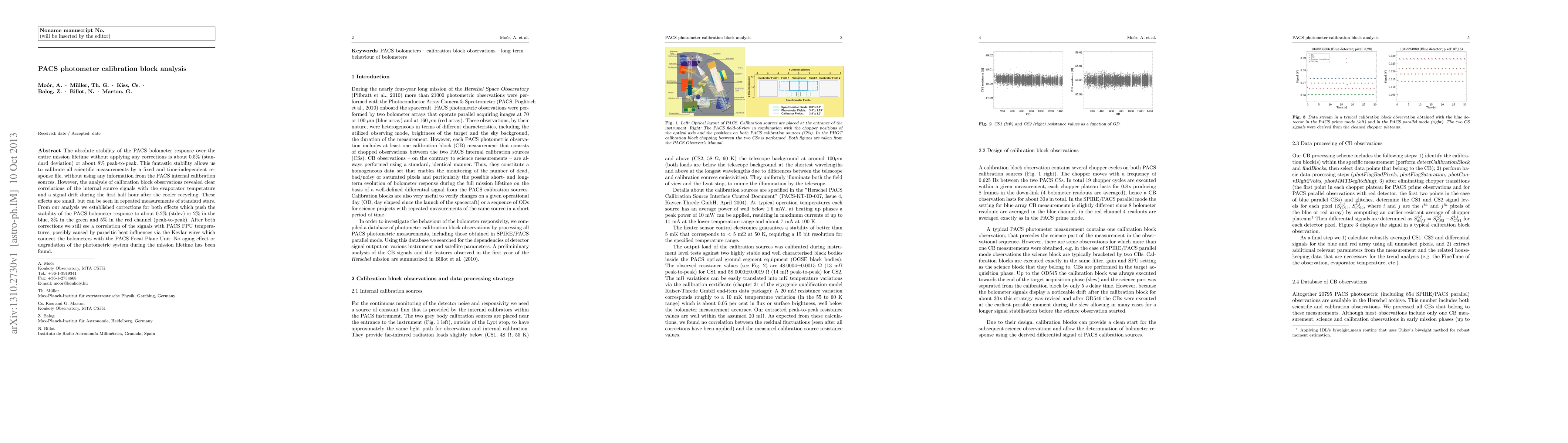 The absolute stability of the PACS bolometer response over the entire mission lifetime without applying any corrections is about 0.5% (standard deviation) or about 8% peak-to-peak. This fantastic stability allows us to calibrate all scientific measurements by a fixed and time-independent response file, without using any information from the PACS internal calibration sources. However, the analysis of calibration block observations revealed clear correlations of the internal source signals with the evaporator temperature and a signal drift during the first half hour after the cooler recycling. These effects are small, but can be seen in repeated measurements of standard stars. From our analysis we established corrections for both effects which push the stability of the PACS bolometer response to about 0.2% (stdev) or 2% in the blue, 3% in the green and 5% in the red channel (peak-to-peak). After both corrections we still see a correlation of the signals with PACS FPU temperatures, possibly caused by parasitic heat influences via the Kevlar wires which connect the bolometers with the PACS Focal Plane Unit. No aging effect or degradation of the photometric system during the mission lifetime has been found.