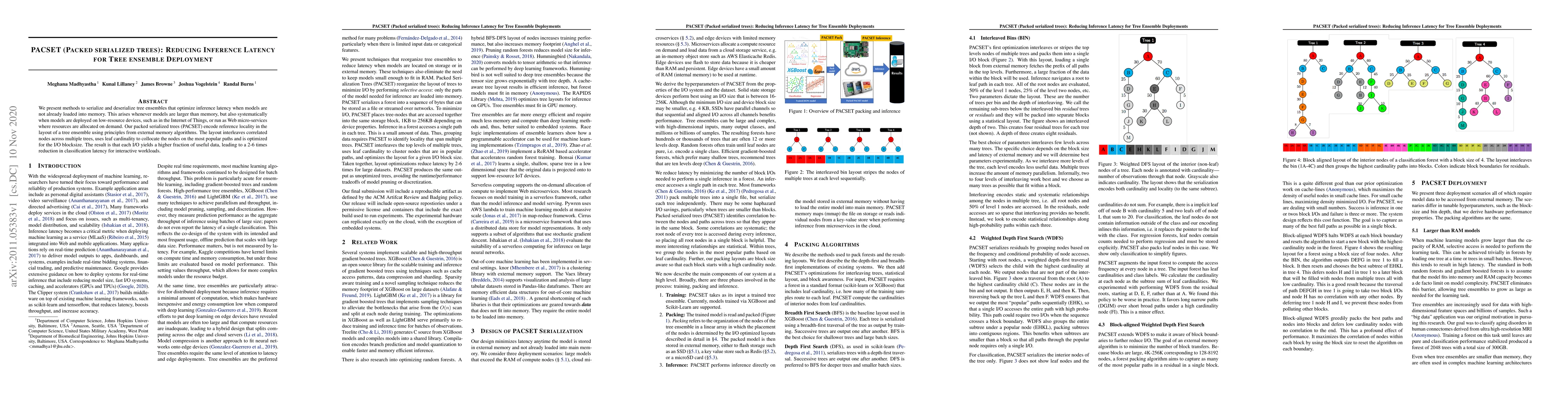 We present methods to serialize and deserialize tree ensembles that optimize inference latency when models are not already loaded into memory. This arises whenever models are larger than memory, but also systematically when models are deployed on low-resource devices, such as in the Internet of Things, or run as Web micro-services where resources are allocated on demand. Our packed serialized trees (PACSET) encode reference locality in the layout of a tree ensemble using principles from external memory algorithms. The layout interleaves correlated nodes across multiple trees, uses leaf cardinality to collocate the nodes on the most popular paths and is optimized for the I/O blocksize. The result is that each I/O yields a higher fraction of useful data, leading to a 2-6 times reduction in classification latency for interactive workloads.