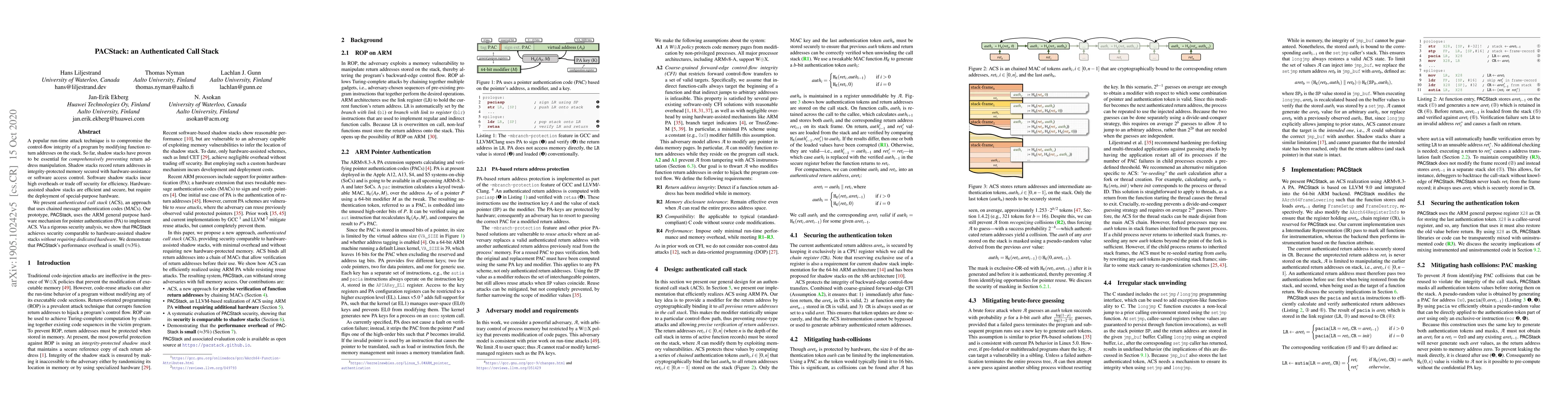 PACStack introduces an authenticated call stack (ACS) using chained message authentication codes (MACs) to secure return addresses, leveraging ARM's pointer authentication mechanism. This approach achieves security comparable to hardware-assisted shadow stacks without requiring special hardware, with a minimal performance overhead of ~3%.