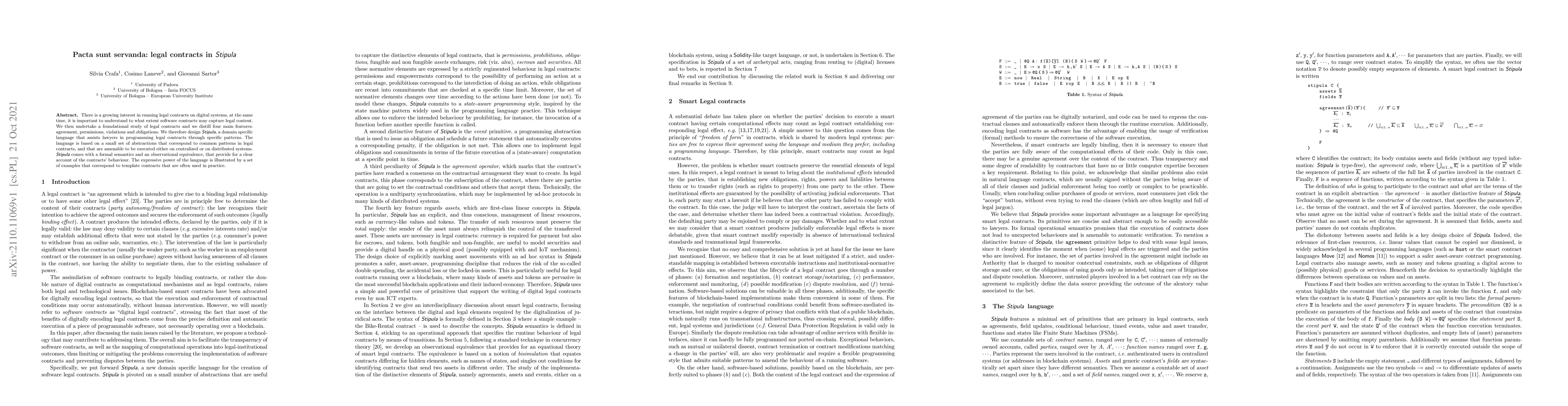 This paper explores the integration of legal contracts into digital systems through Stipula, a domain-specific language designed to assist lawyers in programming legal contracts. It identifies key features of legal contracts and provides a formal semantics and observational equivalence to ensure clear contract behavior.
