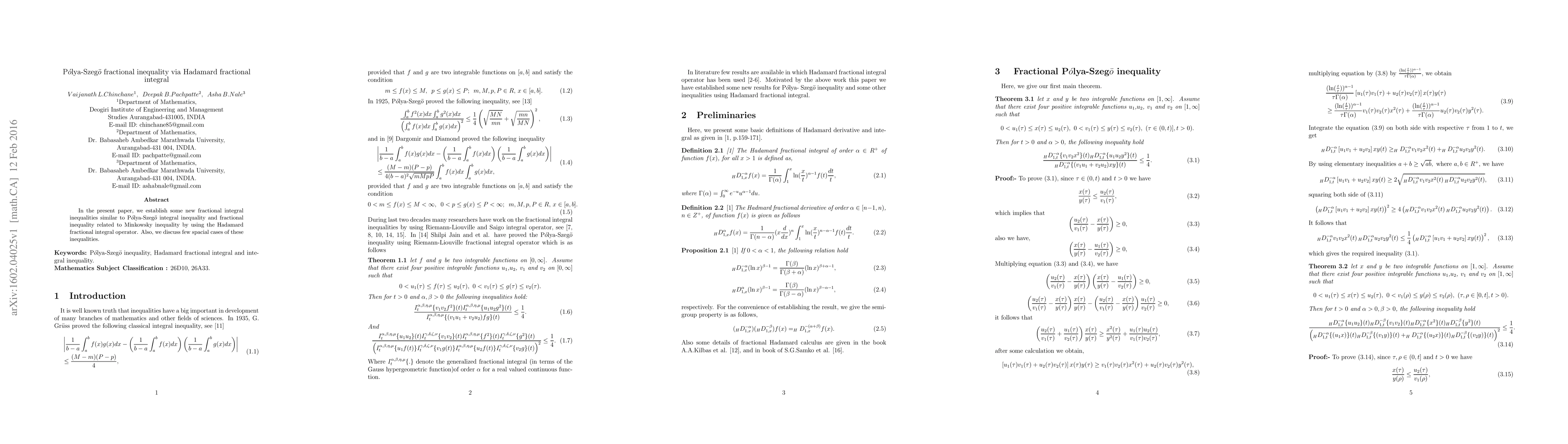 This paper establishes new fractional integral inequalities akin to Pólya-Szegő and Minkowski inequalities using the Hadamard fractional integral operator, and explores specific instances of these inequalities.