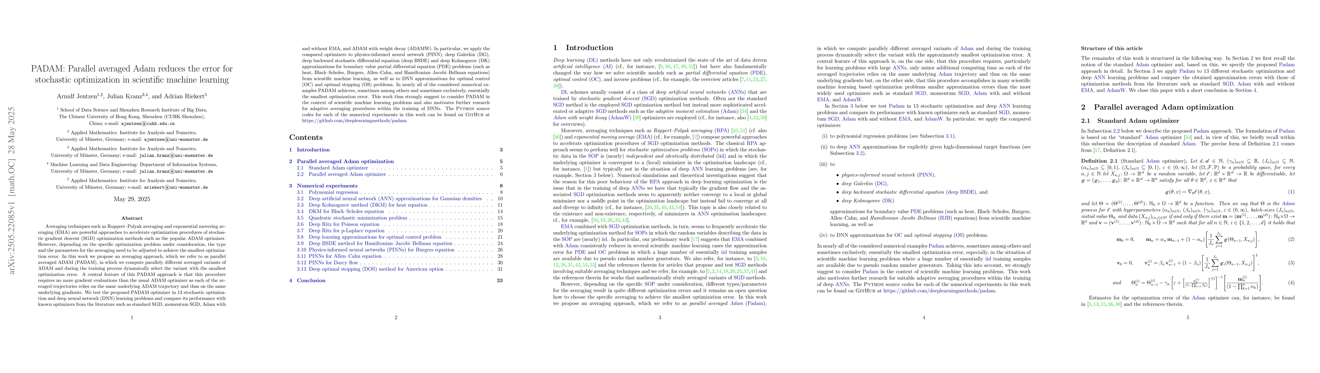 PADAM distinguishes itself by combining multiple averaging techniques and dynamically selecting the optimal variant during training, improving optimization error in scientific machine learning tasks.