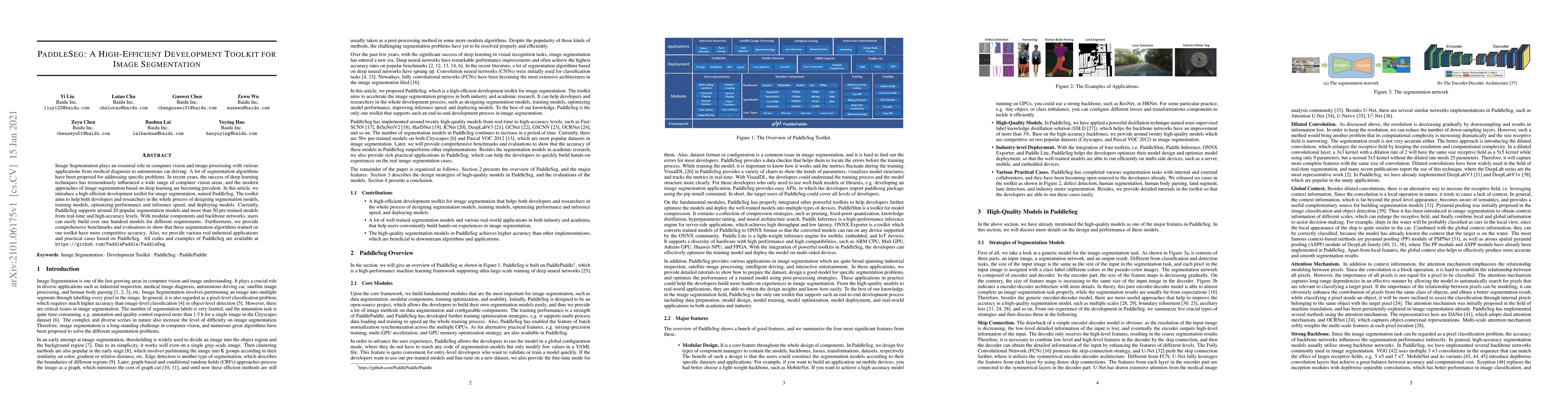 Image Segmentation plays an essential role in computer vision and image processing with various applications from medical diagnosis to autonomous car driving. A lot of segmentation algorithms have been proposed for addressing specific problems. In recent years, the success of deep learning techniques has tremendously influenced a wide range of computer vision areas, and the modern approaches of image segmentation based on deep learning are becoming prevalent. In this article, we introduce a high-efficient development toolkit for image segmentation, named PaddleSeg. The toolkit aims to help both developers and researchers in the whole process of designing segmentation models, training models, optimizing performance and inference speed, and deploying models. Currently, PaddleSeg supports around 20 popular segmentation models and more than 50 pre-trained models from real-time and high-accuracy levels. With modular components and backbone networks, users can easily build over one hundred models for different requirements. Furthermore, we provide comprehensive benchmarks and evaluations to show that these segmentation algorithms trained on our toolkit have more competitive accuracy. Also, we provide various real industrial applications and practical cases based on PaddleSeg. All codes and examples of PaddleSeg are available at https://github.com/PaddlePaddle/PaddleSeg.