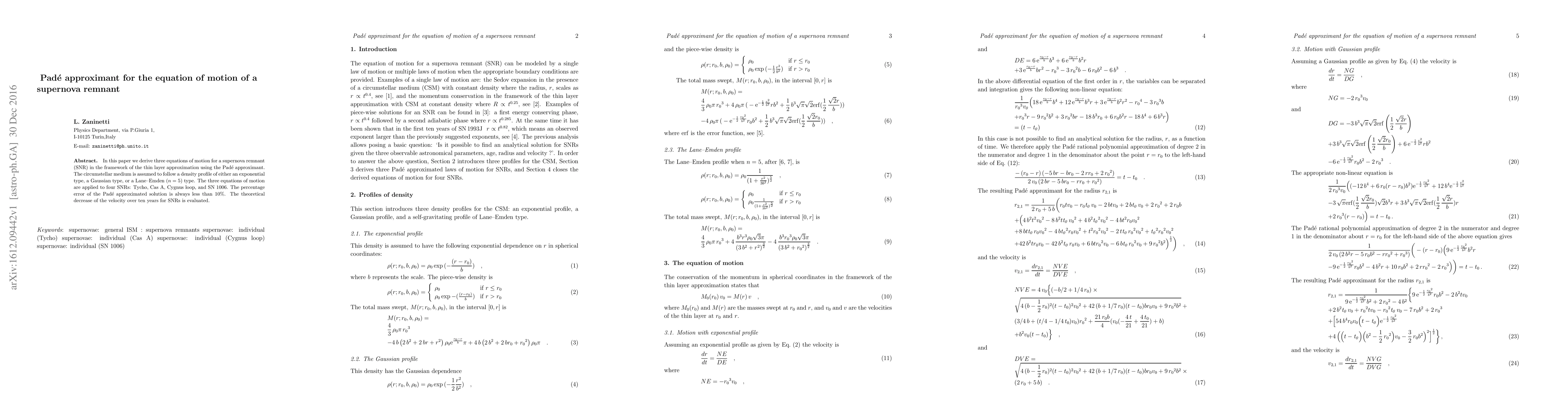 In this paper we derive three equations of motion for a supernova remnant (SNR) in the framework of the thin layer approximation using the Pad\'e approximant. The circumstellar medium is assumed to follow a density profile of either an exponential type, a Gaussian type, or a Lane--Emden ($n=5$) type. The three equations of motion are applied to four SNRs: Tycho, Cas A, Cygnus loop, and SN~1006. The percentage error of the Pad\'e approximated solution is always less than $10\%$. The theoretical decrease of the velocity over ten years for SNRs is evaluated.