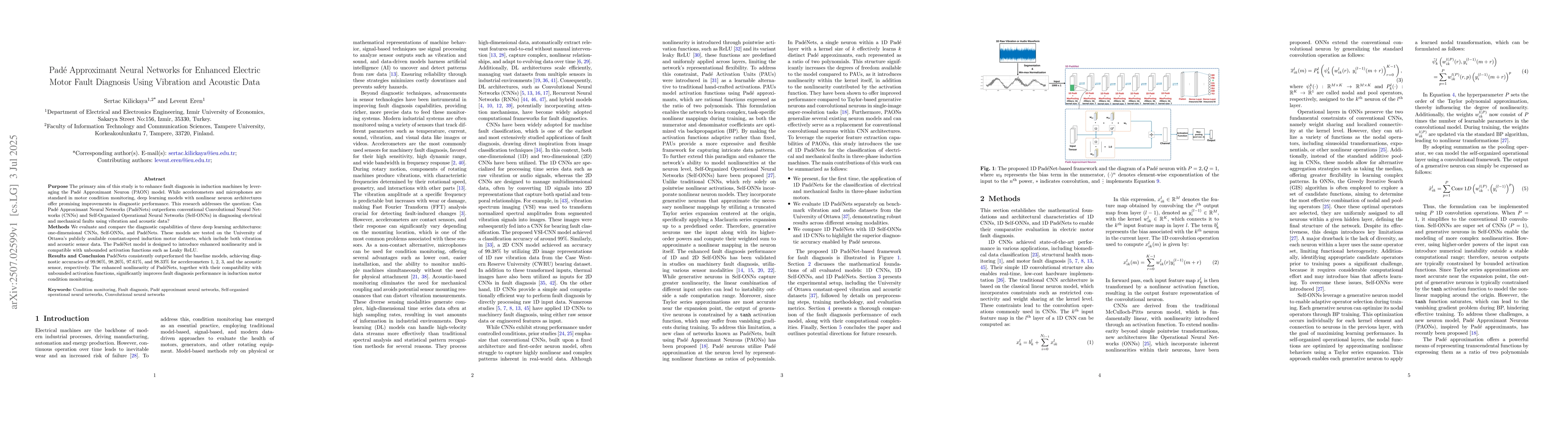 Purpose: The primary aim of this study is to enhance fault diagnosis in induction machines by leveraging the Pad\'e Approximant Neuron (PAON) model. While accelerometers and microphones are standard in motor condition monitoring, deep learning models with nonlinear neuron architectures offer promising improvements in diagnostic performance. This research addresses the question: Can Pad\'e Approximant Neural Networks (Pad\'eNets) outperform conventional Convolutional Neural Networks (CNNs) and Self-Organized Operational Neural Networks (Self-ONNs) in diagnosing electrical and mechanical faults using vibration and acoustic data? Methods: We evaluate and compare the diagnostic capabilities of three deep learning architectures: one-dimensional CNNs, Self-ONNs, and Pad\'eNets. These models are tested on the University of Ottawa's publicly available constant-speed induction motor datasets, which include both vibration and acoustic sensor data. The Pad\'eNet model is designed to introduce enhanced nonlinearity and is compatible with unbounded activation functions such as Leaky ReLU. Results and Conclusion: Pad\'eNets consistently outperformed the baseline models, achieving diagnostic accuracies of 99.96%, 98.26%, 97.61%, and 98.33% for accelerometers 1, 2, 3, and the acoustic sensor, respectively. The enhanced nonlinearity of Pad\'eNets, together with their compatibility with unbounded activation functions, significantly improves fault diagnosis performance in induction motor condition monitoring.