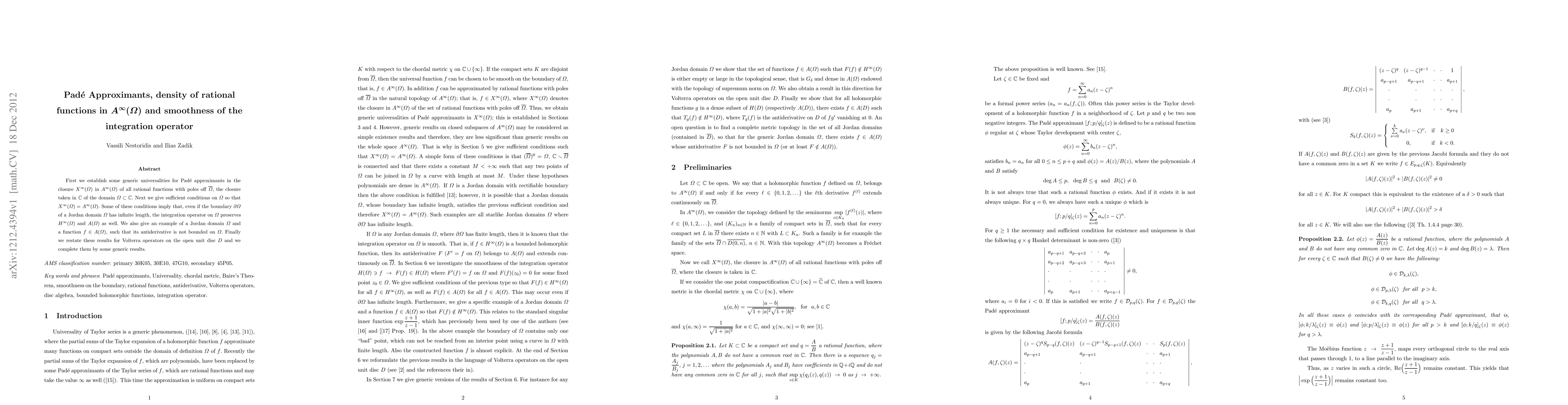 First we establish some generic universalities for Pad\'{e} approximants in the closure $X^\infty(\OO)$ in $A^\infty(\OO)$ of all rational functions with poles off $\oO$, the closure taken in $\C$ of the domain $\OO\subset\C$.\ Next we give sufficient conditions on $\OO$ so that $X^\infty(\OO)=A^\infty(\OO)$.\ Some of these conditions imply that, even if the boundary $\partial\OO$ of a Jordan domain $\OO$ has infinite length, the integration operator on $\OO$ preserves $H^\infty(\OO)$ and $A(\OO)$ as well.\ We also give an example of a Jordan domain $\OO$ and a function $f\in A(\OO)$, such that its antiderivative is not bounded on $\OO$.\ Finally we restate these results for Volterra operators on the open unit disc $D$ and we complete them by some generic results.