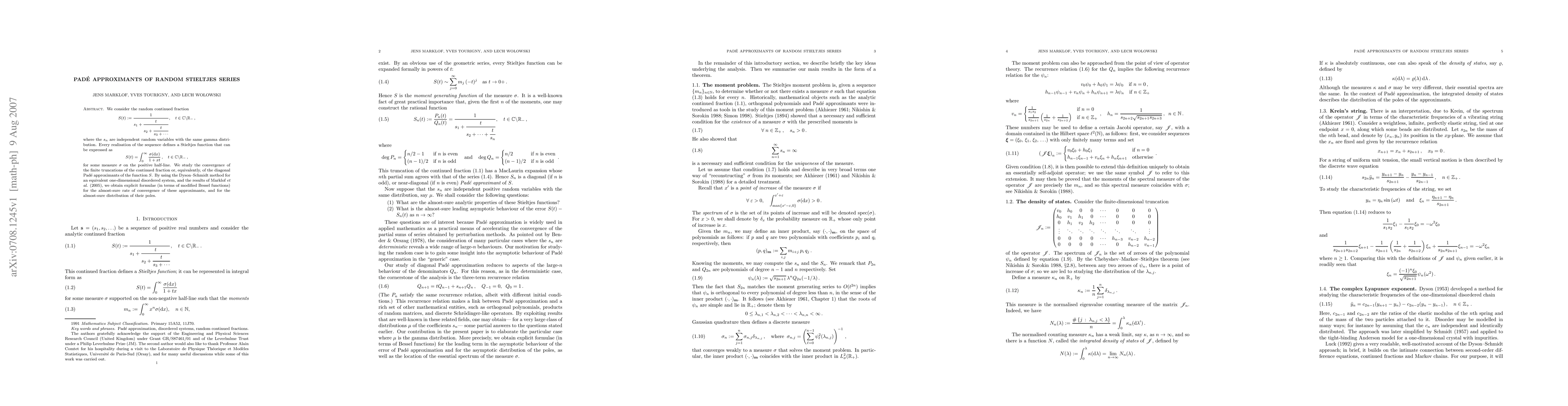 The study examines the convergence of finite truncations of a random continued fraction, equivalent to diagonal Pade approximants of the function S(t). It employs the Dyson--Schmidt method for a one-dimensional disordered system and results from Marklof et al. (2005) to derive explicit formulae for the rate of convergence and distribution of poles.