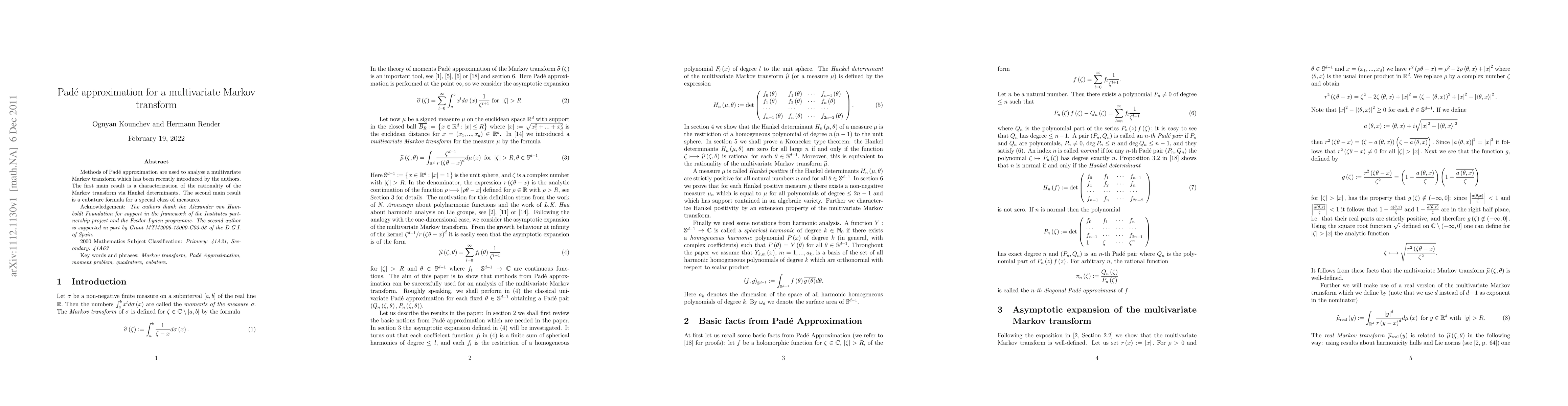 This paper applies Padé approximation to analyze a newly introduced multivariate Markov transform, generalizing the Stieltjes transform. It characterizes the rationality of the Markov transform through Hankel determinants and provides a cubature formula for a specific class of measures.
