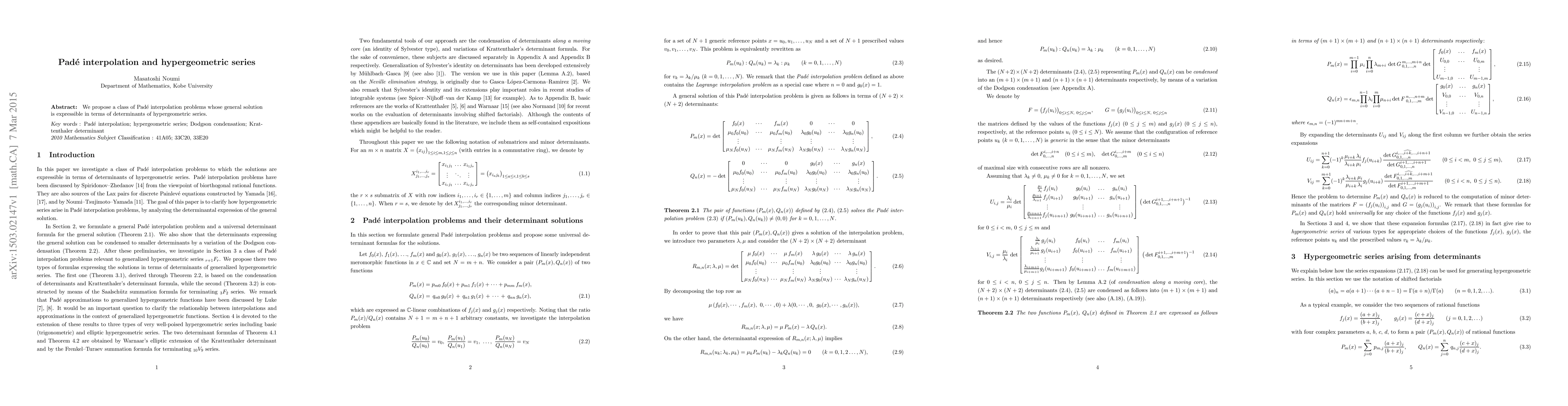 Summary: This paper introduces a novel class of Padé interpolation problems, with solutions represented through determinants of hypergeometric series, offering a new perspective on the relationship between these mathematical constructs.