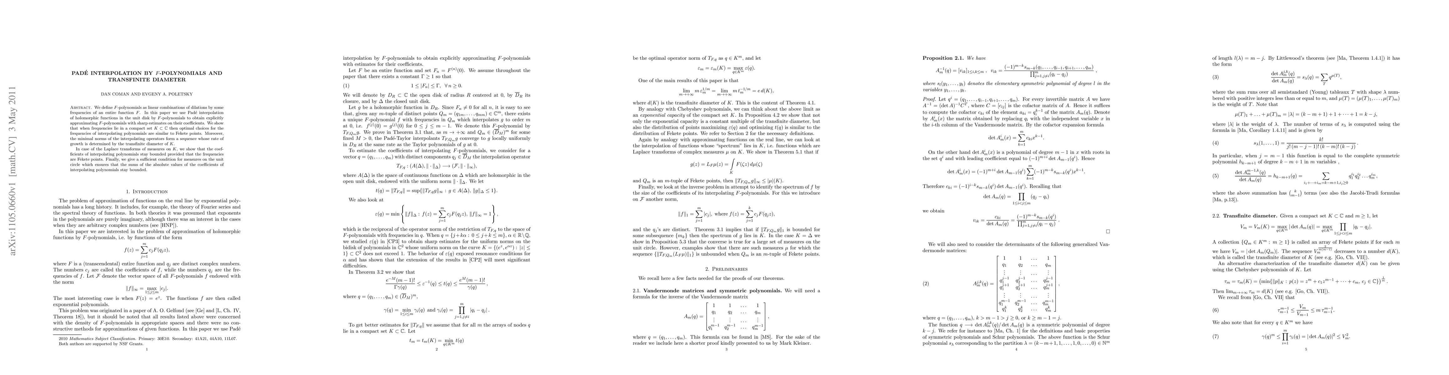 We define $F$-polynomials as linear combinations of dilations by some frequencies of an entire function $F$. In this paper we use Pade interpolation of holomorphic functions in the unit disk by $F$-polynomials to obtain explicitly approximating $F$-polynomials with sharp estimates on their coefficients. We show that when frequencies lie in a compact set $K\subset\mathbb C$ then optimal choices for the frequencies of interpolating polynomials are similar to Fekete points. Moreover, the minimal norms of the interpolating operators form a sequence whose rate of growth is determined by the transfinite diameter of $K$. In case of the Laplace transforms of measures on $K$, we show that the coefficients of interpolating polynomials stay bounded provided that the frequencies are Fekete points. Finally, we give a sufficient condition for measures on the unit circle which ensures that the sums of the absolute values of the coefficients of interpolating polynomials stay bounded.