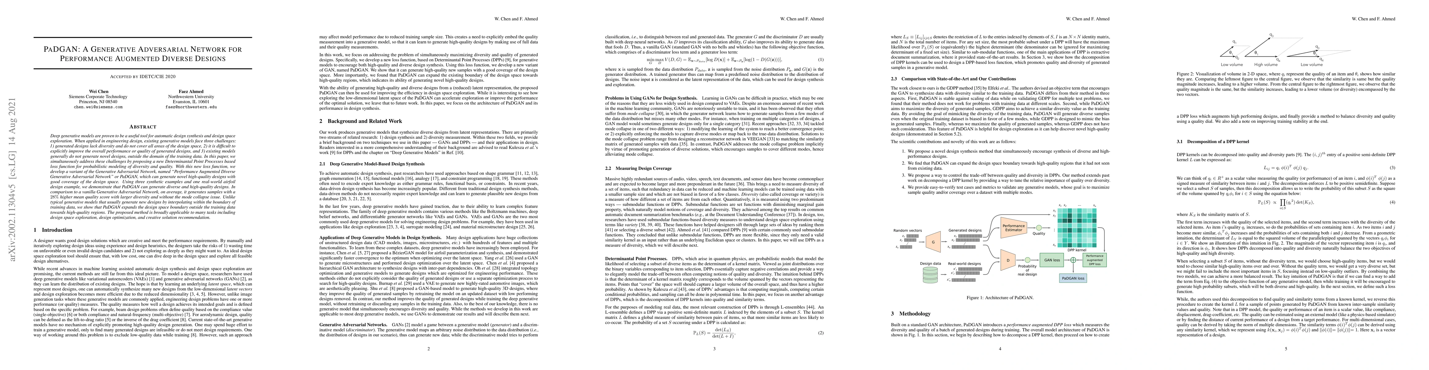 PaDGAN introduces a novel loss function based on Determinantal Point Processes to enhance diversity and quality in generative design models. It outperforms traditional GANs by generating novel, high-quality designs with broader coverage of the design space, as demonstrated through synthetic and real-world airfoil examples.