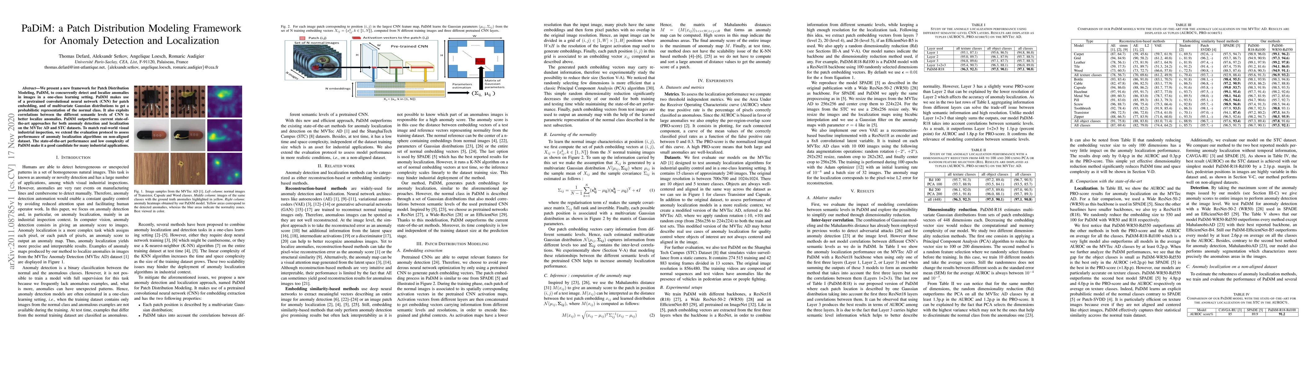 This research introduces PaDiM, a novel Patch Distribution Modeling framework for detecting and localizing anomalies in images using a one-class learning approach. It leverages a pretrained CNN and multivariate Gaussian distributions for probabilistic representation, achieving superior performance on MVTec AD and STC datasets. The framework's effectiveness is further demonstrated through an extended evaluation protocol for non-aligned datasets, highlighting its potential for industrial applications.