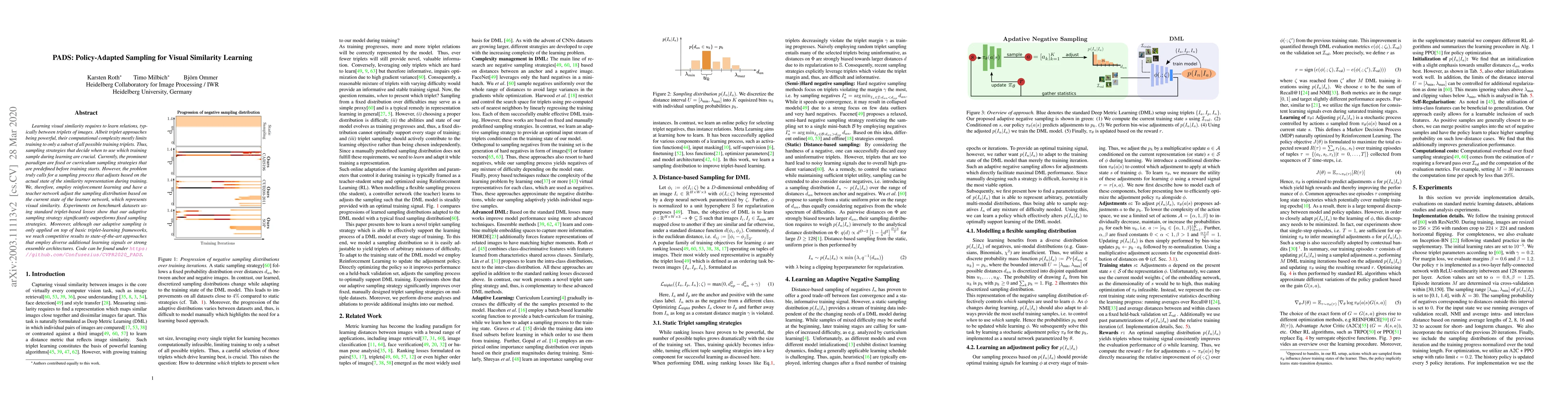 The paper introduces PADS, a Policy-Adapted Sampling method that uses reinforcement learning to dynamically adjust the sampling of training triplets during visual similarity learning, significantly outperforming fixed sampling strategies and achieving competitive results against state-of-the-art approaches. The adaptive sampling enhances the training process by aligning the sampling distribution with the current state of the learner network.