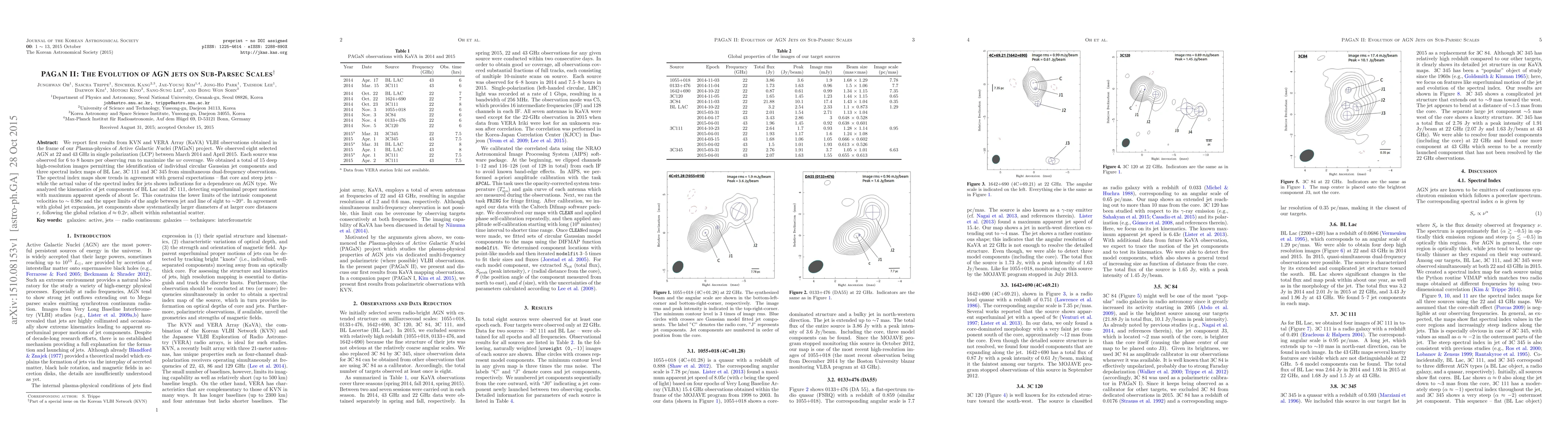We report first results from KVN and VERA Array (KaVA) VLBI observations obtained in the frame of our Plasma-physics of Active Galactic Nuclei (PAGaN) project. We observed eight selected AGN at 22 and 43 GHz in single polarization (LCP) between March 2014 and April 2015. Each source was observed for 6 to 8 hours per observing run to maximize the $uv$ coverage. We obtained a total of 15 deep high-resolution images permitting the identification of individual circular Gaussian jet components and three spectral index maps of BL Lac, 3C 111 and 3C 345 from simultaneous dual-frequency observations. The spectral index maps show trends in agreement with general expectations -- flat core and steep jets -- while the actual value of the spectral index for jets shows indications for a dependence on AGN type. We analyzed the kinematics of jet components of BL Lac and 3C 111, detecting superluminal proper motions with maximum apparent speeds of about $5c$. This constrains the lower limits of the intrinsic component velocities to $\sim0.98c$ and the upper limits of the angle between jet and line of sight to $\sim$20$\deg$. In agreement with global jet expansion, jet components show systematically larger diameters $d$ at larger core distances $r$, following the global relation $d\approx0.2r$, albeit within substantial scatter.