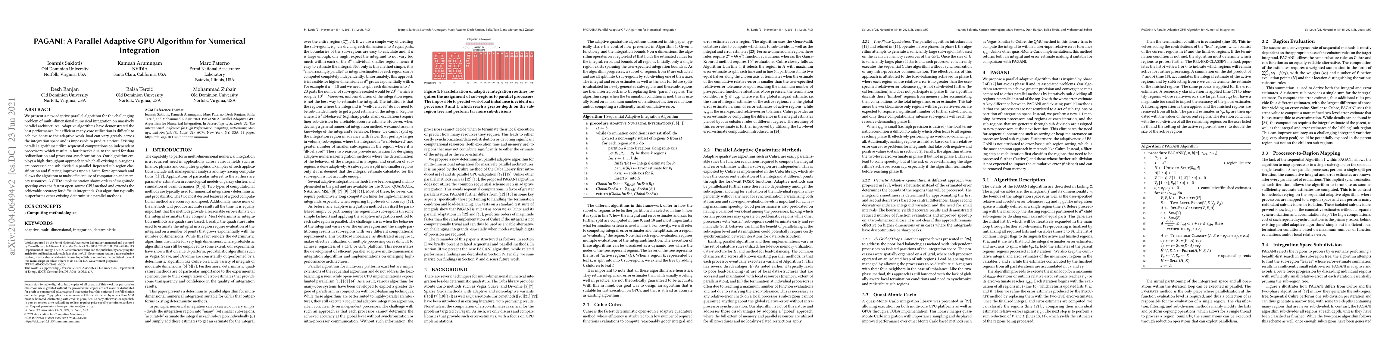 The PAGANI algorithm is an adaptive parallel method for multi-dimensional numerical integration on GPU architectures, achieving significant speedups over CPU-based methods by efficiently utilizing many-core resources through parallel processing and sub-region subdivision. It demonstrates superior performance compared to other parallel algorithms by leveraging high-throughput and adaptive workload management.