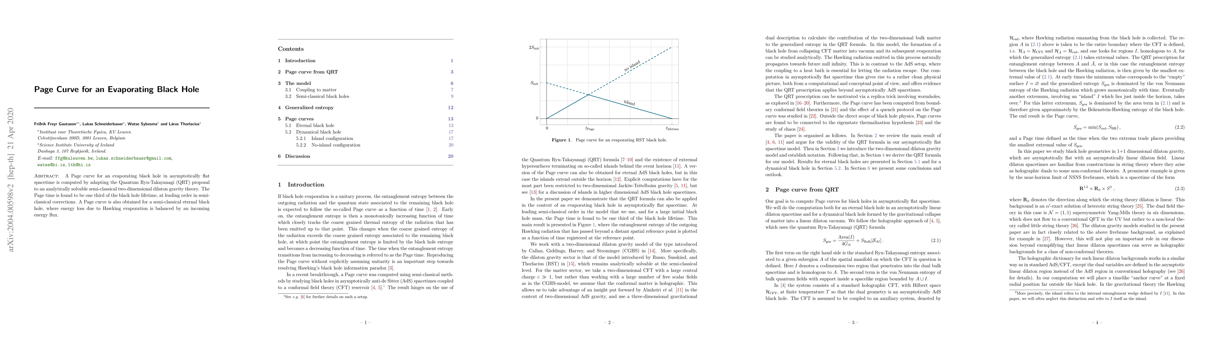 A Page curve for an evaporating black hole in asymptotically flat spacetime is computed by adapting the Quantum Ryu-Takayanagi (QRT) proposal to an analytically solvable semi-classical two-dimensional dilaton gravity theory. The Page time is found to be one third of the black hole lifetime, at leading order in semi-classical corrections. A Page curve is also obtained for a semi-classical eternal black hole, where energy loss due to Hawking evaporation is balanced by an incoming energy flux.