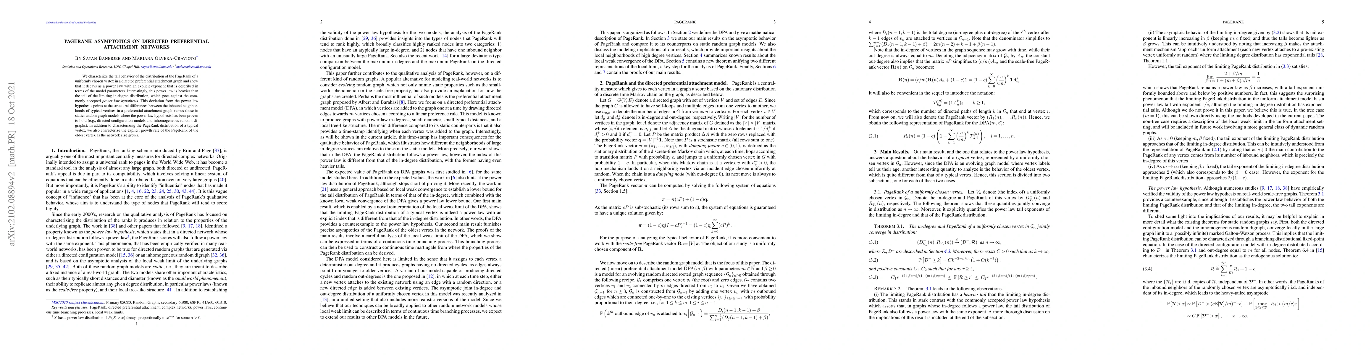 This paper investigates the tail behavior of PageRank in directed preferential attachment networks, revealing a power law decay with a specific exponent dependent on model parameters. It challenges the power law hypothesis by demonstrating that the tail of PageRank decays more slowly than the in-degree distribution, highlighting structural differences in preferential attachment graphs compared to static random graph models.