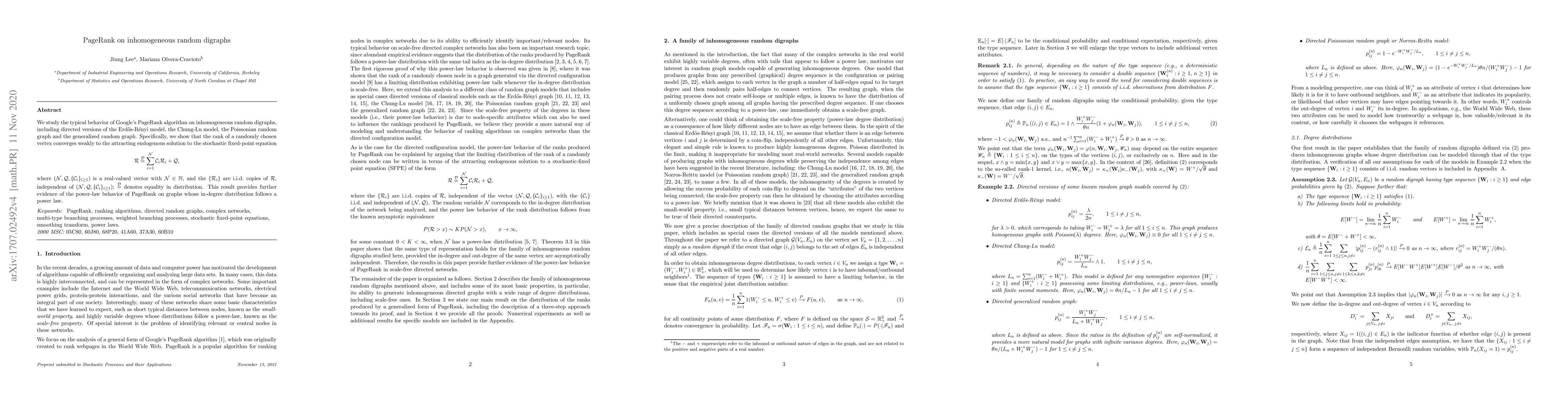 We study the typical behavior of a generalized version of Google's PageRank algorithm on a large family of inhomogeneous random digraphs. This family includes as special cases directed versions of classical models such as the Erd\"os-R\'enyi model, the Chung-Lu model, the Poissonian random graph and the generalized random graph, and is suitable for modeling scale-free directed complex networks where the number of neighbors a vertex has is related to its attributes. In particular, we show that the rank of a randomly chosen node in a graph from this family converges weakly to the attracting endogenous solution to the stochastic fixed-point equation $$\mathcal{R} \stackrel{\mathcal{D}}{=} \sum_{i=1}^{\mathcal{N}} \mathcal{C}_i \mathcal{R}_i + \mathcal{Q},$$ where $(\mathcal{N}, \mathcal{Q}, \{\mathcal{C}_i\}_{i \geq 1})$ is a real-valued vector with $\mathcal{N}\in \{0,1,2,...\}$, the $\{ \mathcal{R}_i\}$ are i.i.d.~copies of $\mathcal{R}$, independent of $(\mathcal{N}, \mathcal{Q}, \{\mathcal{C}_i\}_{i \geq 1})$, with $\{ \mathcal{C}_i\}$ i.i.d.~and independent of $(\mathcal{N}, \mathcal{Q})$; $\stackrel{\mathcal{D}}{=}$ denotes equality in distribution. This result can then be used to provide further evidence of the power-law behavior of PageRank on scale-free graphs.