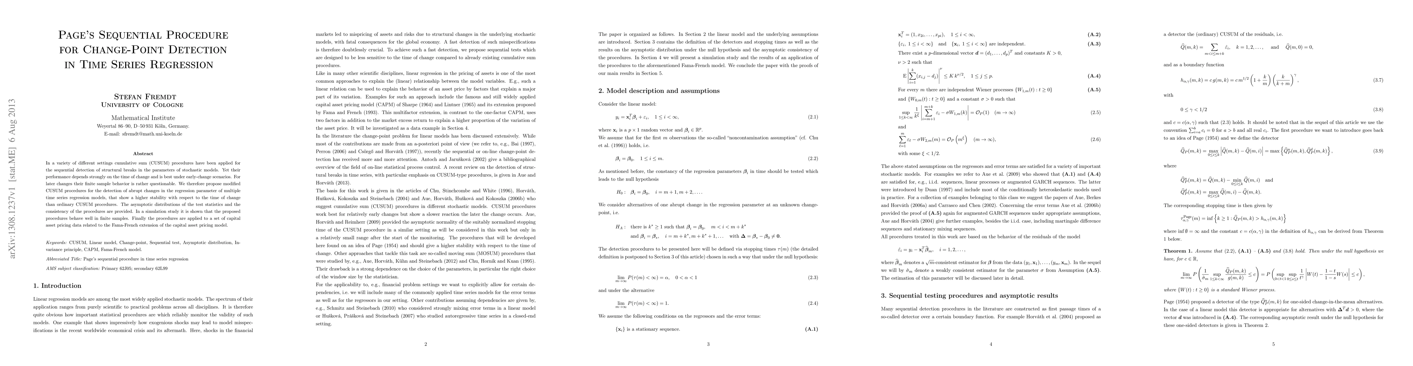 This paper proposes modified CUSUM procedures for detecting abrupt changes in the regression parameters of time series models, offering improved stability over traditional CUSUM methods, especially for later changes. Simulation results demonstrate the effectiveness of these procedures in finite samples, and they are applied to capital asset pricing model data.