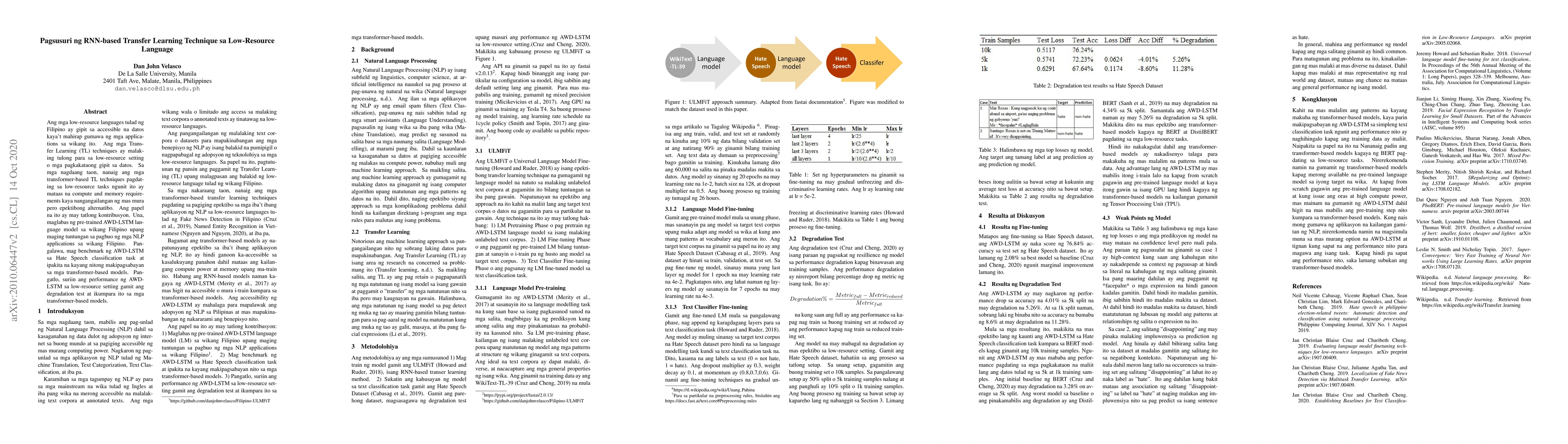 Low-resource languages such as Filipino suffer from data scarcity which makes it challenging to develop NLP applications for Filipino language. The use of Transfer Learning (TL) techniques alleviates this problem in low-resource setting. In recent years, transformer-based models are proven to be effective in low-resource tasks but faces challenges in accessibility due to its high compute and memory requirements. For this reason, there's a need for a cheaper but effective alternative. This paper has three contributions. First, release a pre-trained AWD-LSTM language model for Filipino language. Second, benchmark AWD-LSTM in the Hate Speech classification task and show that it performs on par with transformer-based models. Third, analyze the the performance of AWD-LSTM in low-resource setting using degradation test and compare it with transformer-based models. ----- Ang mga low-resource languages tulad ng Filipino ay gipit sa accessible na datos kaya't mahirap gumawa ng mga applications sa wikang ito. Ang mga Transfer Learning (TL) techniques ay malaking tulong para sa low-resource setting o mga pagkakataong gipit sa datos. Sa mga nagdaang taon, nanaig ang mga transformer-based TL techniques pagdating sa low-resource tasks ngunit ito ay mataas na compute and memory requirements kaya nangangailangan ng mas mura pero epektibong alternatibo. Ang papel na ito ay may tatlong kontribusyon. Una, maglabas ng pre-trained AWD-LSTM language model sa wikang Filipino upang maging tuntungan sa pagbuo ng mga NLP applications sa wikang Filipino. Pangalawa, mag benchmark ng AWD-LSTM sa Hate Speech classification task at ipakita na kayang nitong makipagsabayan sa mga transformer-based models. Pangatlo, suriin ang performance ng AWD-LSTM sa low-resource setting gamit ang degradation test at ikumpara ito sa mga transformer-based models.