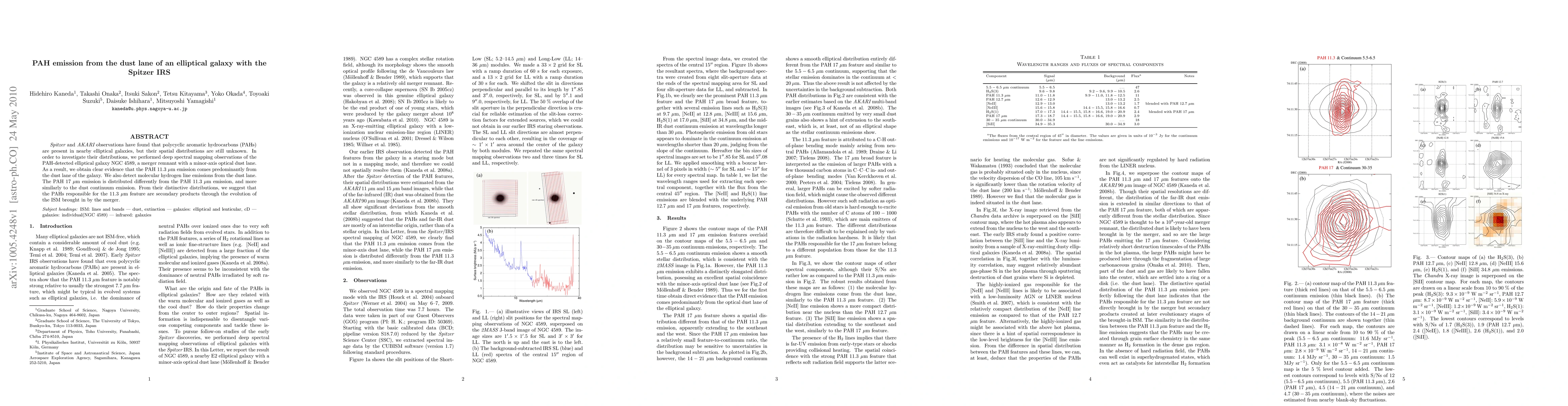 This paper investigates the spatial distribution of polycyclic aromatic hydrocarbons (PAHs) in the elliptical galaxy NGC4589 using Spitzer and AKARI observations. The study finds that PAH 11.3 um emission predominantly originates from the galaxy's dust lane, while the PAH 17 um emission correlates more with dust continuum emission, suggesting different origins for these PAH features.