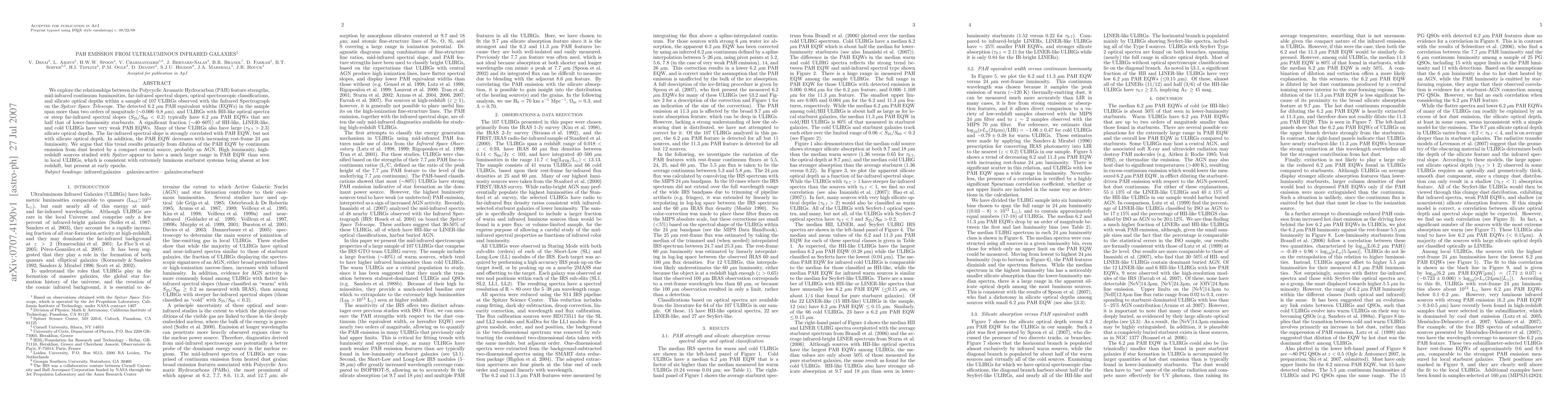 The paper presents a comprehensive analysis of PAH emission properties in ULIRGs, correlating them with various spectral and luminosity indicators, and proposes a dilution mechanism for the decreased PAH EQW in high-luminosity sources.