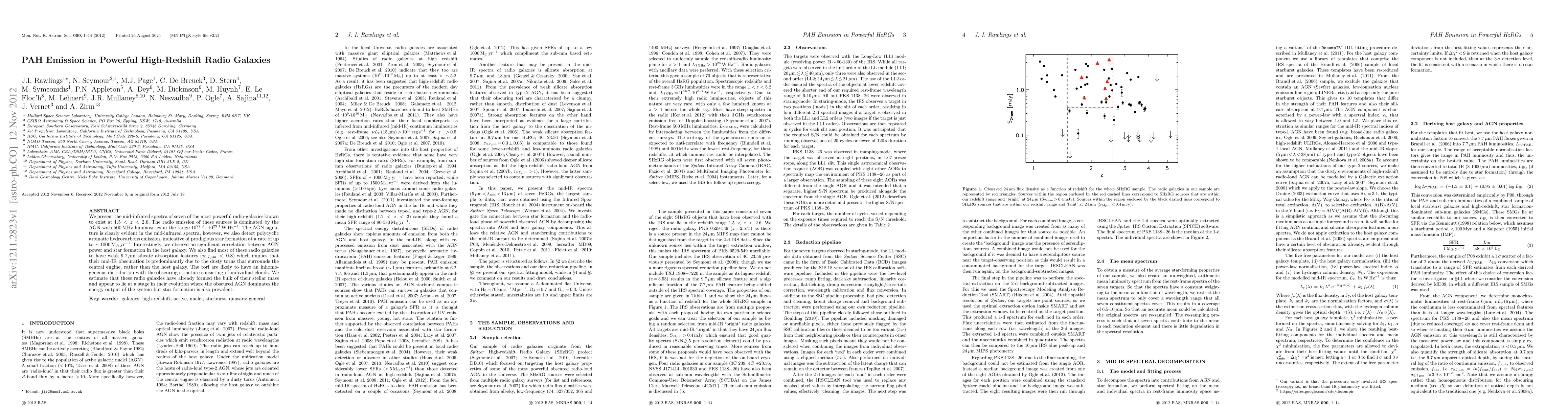 We present the mid-infrared spectra of seven of the most powerful radio-galaxies known to exist at 1.5 < z < 2.6. The radio emission of these sources is dominated by the AGN with 500 MHz luminosities in the range 10^27.8 - 10^29.1 W/Hz. The AGN signature is clearly evident in the mid-infrared spectra, however, we also detect polycyclic aromatic hydrocarbons emission, indicative of prodigious star formation at a rate of up to ~1000 Msun/yr. Interestingly, we observe no significant correlation between AGN power and star formation in the host galaxy. We also find most of these radio galaxies to have weak 9.7 um silicate absorption features (tau_{9.7 um} < 0.8) which implies that their mid-IR obscuration is predominantly due to the dusty torus that surrounds the central engine, rather than the host galaxy. The tori are likely to have an inhomogeneous distribution with the obscuring structure consisting of individual clouds. We estimate that these radio galaxies have already formed the bulk of their stellar mass and appear to lie at a stage in their evolution where the obscured AGN dominates the energy output of the system but star formation is also prevalent.