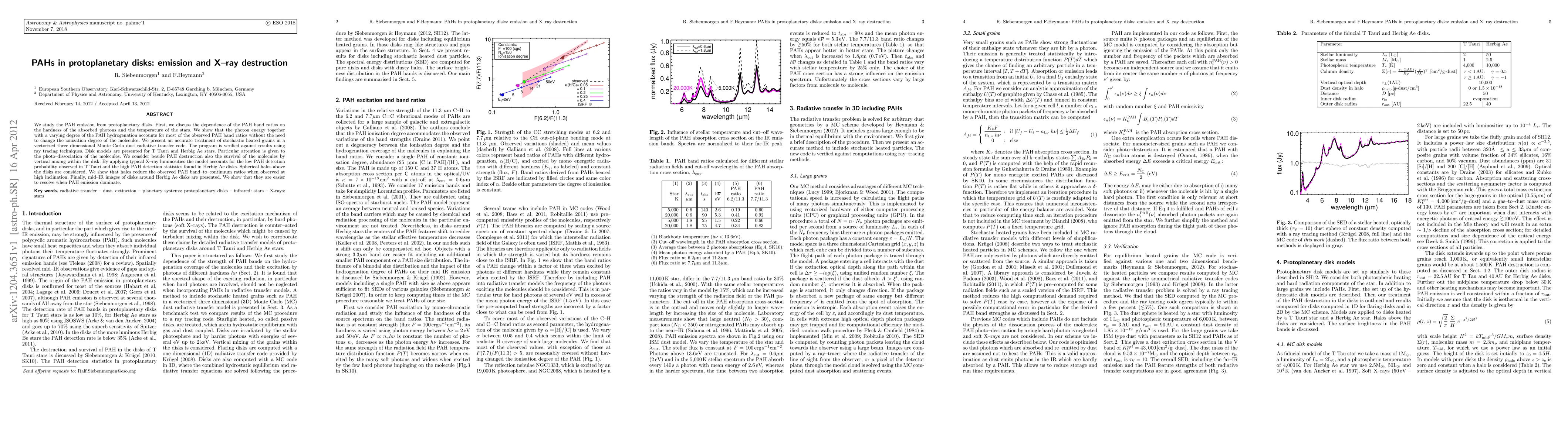 This paper investigates PAH emission in protoplanetary disks, demonstrating that PAH band ratios depend on the absorbed photon energy and star temperature, with hydrogenation degree variations explaining most observed ratios. It models PAH destruction via X-ray exposure and survival through vertical mixing, explaining differing PAH detection rates in T Tauri and Herbig Ae disks.