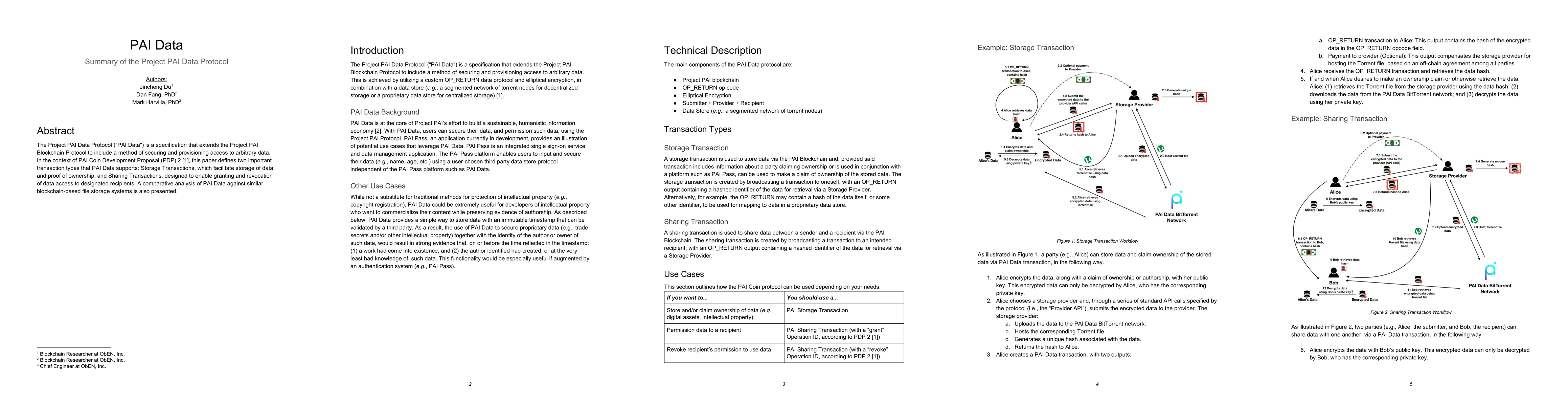 The Project PAI Data Protocol ("PAI Data") is a specification that extends the Project PAI Blockchain Protocol to include a method of securing and provisioning access to arbitrary data. In the context of PAI Coin Development Proposal (PDP) 2, this paper defines two important transaction types that PAI Data supports: Storage Transactions, which facilitate storage of data and proof of ownership, and Sharing Transactions, designed to enable granting and revocation of data access to designated recipients. A comparative analysis of PAI Data against similar blockchain-based file storage systems is also presented.
