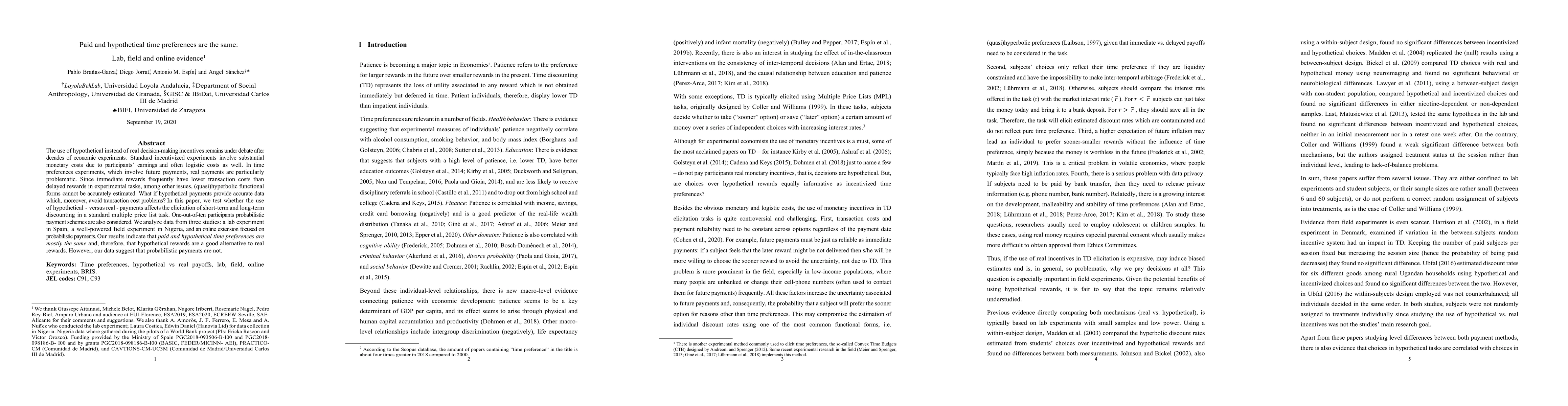 The use of hypothetical instead of real decision-making incentives remains under debate after decades of economic experiments. Standard incentivized experiments involve substantial monetary costs due to participants' earnings and often logistic costs as well. In time preferences experiments, which involve future payments, real payments are particularly problematic. Since immediate rewards frequently have lower transaction costs than delayed rewards in experimental tasks, among other issues, (quasi)hyperbolic functional forms cannot be accurately estimated. What if hypothetical payments provide accurate data which, moreover, avoid transaction cost problems? In this paper, we test whether the use of hypothetical - versus real - payments affects the elicitation of short-term and long-term discounting in a standard multiple price list task. One-out-of-ten participants probabilistic payment schemes are also considered. We analyze data from three studies: a lab experiment in Spain, a well-powered field experiment in Nigeria, and an online extension focused on probabilistic payments. Our results indicate that paid and hypothetical time preferences are mostly the same and, therefore, that hypothetical rewards are a good alternative to real rewards. However, our data suggest that probabilistic payments are not.