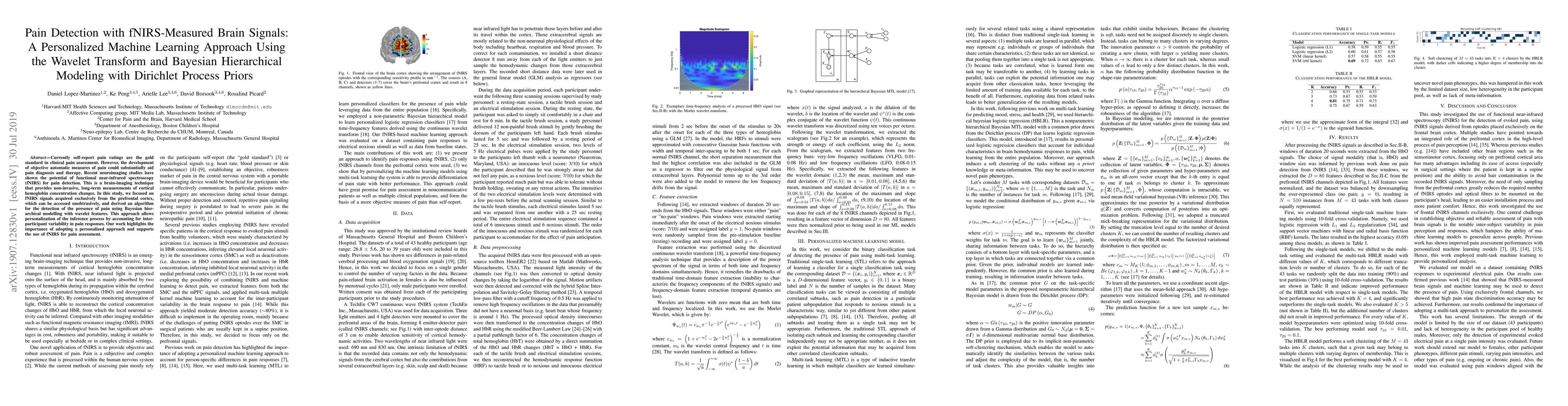 This paper proposes a personalized machine learning method using fNIRS brain signals and wavelet features, with Bayesian hierarchical modeling and Dirichlet process priors, to detect pain objectively. The study emphasizes the potential of fNIRS for non-invasive pain assessment and highlights the importance of personalized approaches to account for individual variability in pain responses.