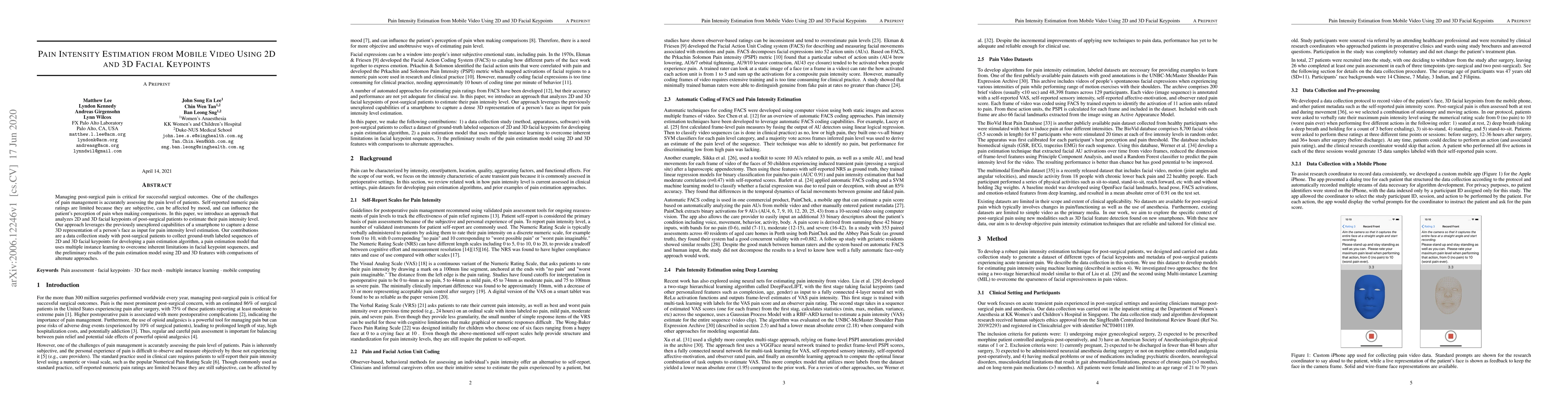 This paper proposes a method to estimate post-surgical pain intensity by analyzing 2D and 3D facial keypoints captured via smartphone. The study includes a data collection from patients and a pain estimation model using multiple instance learning, showing preliminary results comparing different approaches.