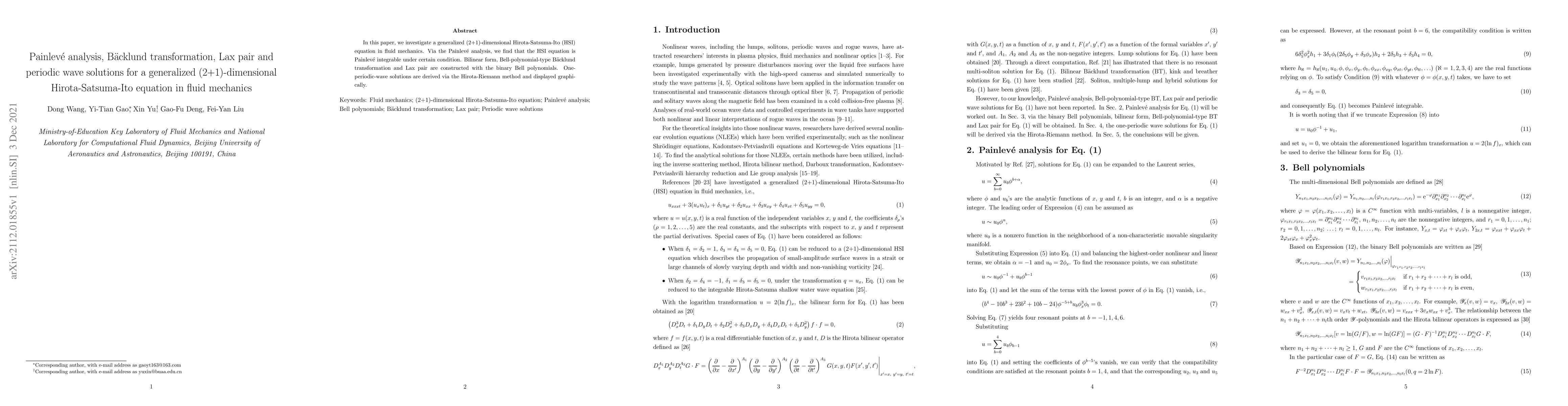This paper explores a generalized (2+1)-dimensional Hirota-Satsuma-Ito equation in fluid mechanics, demonstrating its Painlevé integrability and constructing a Backlund transformation and Lax pair. Periodic wave solutions are derived and visualized.